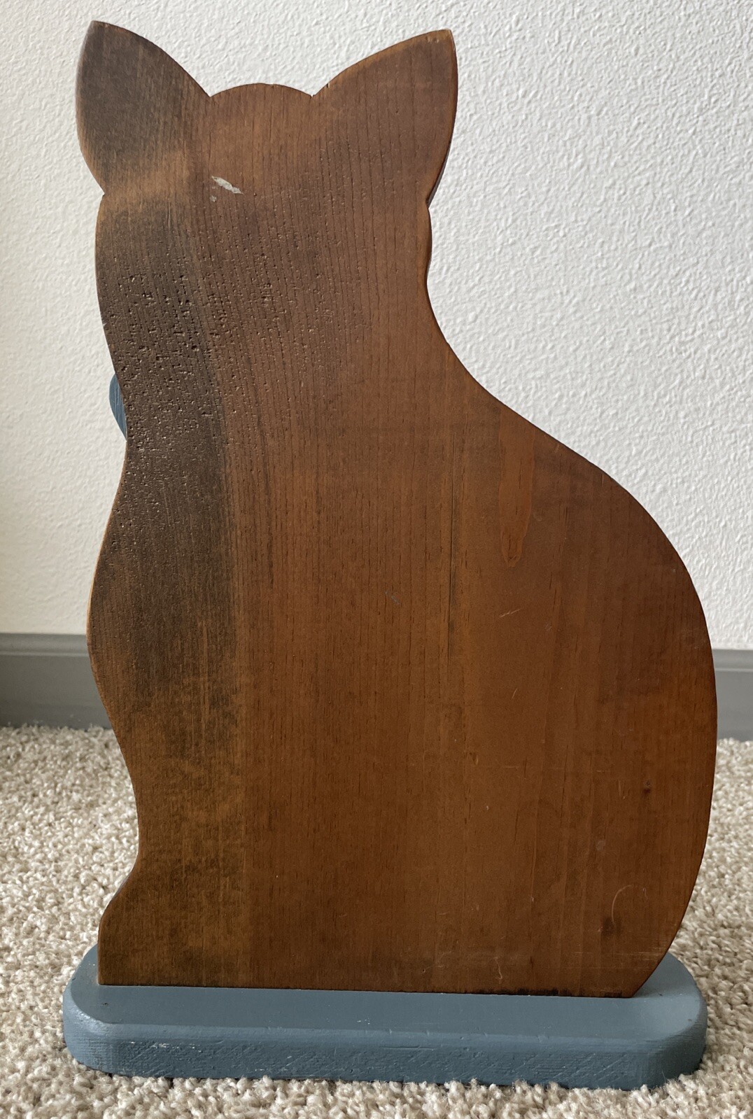 • Vintage Wooden Cat Standing Large Figure Home Decor Hand Painted Brown Blue