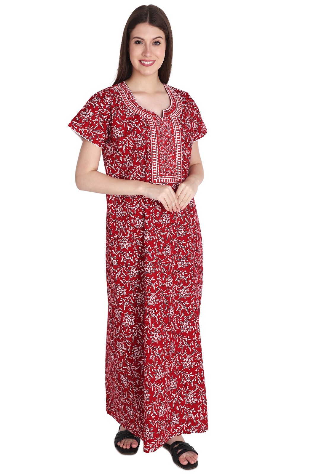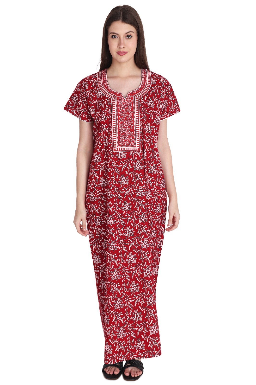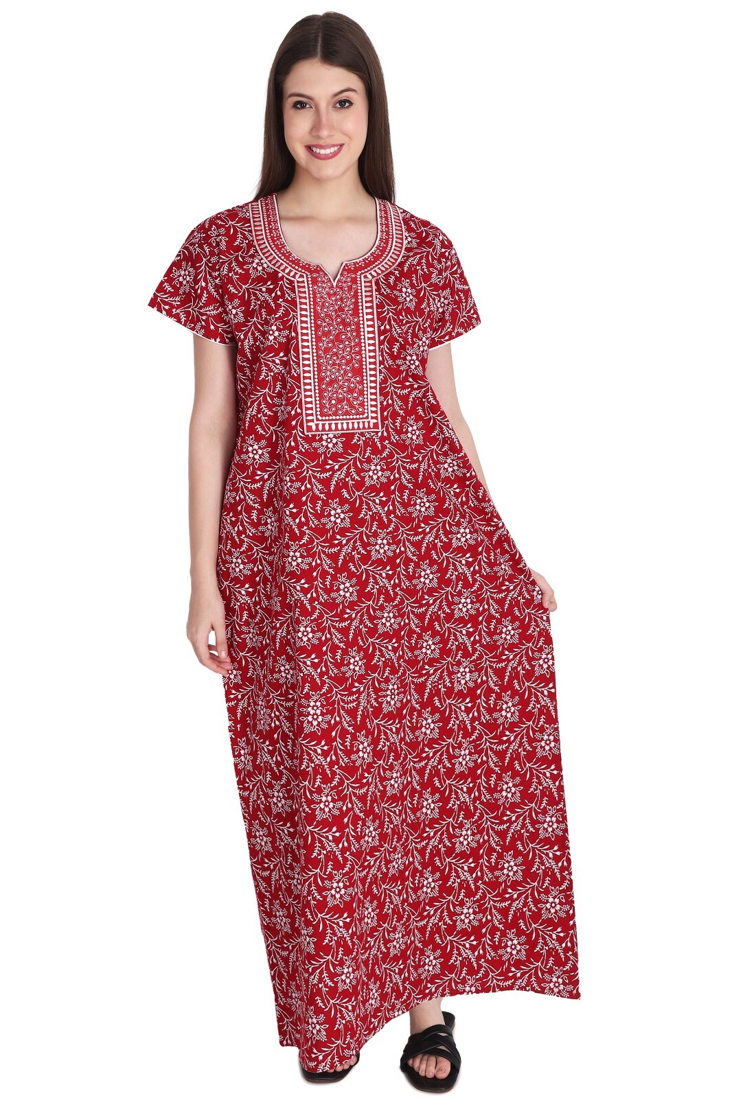 Indian Women's Red Cotton Embroidery Nighty for Girls Night Gown Embroidery Neck