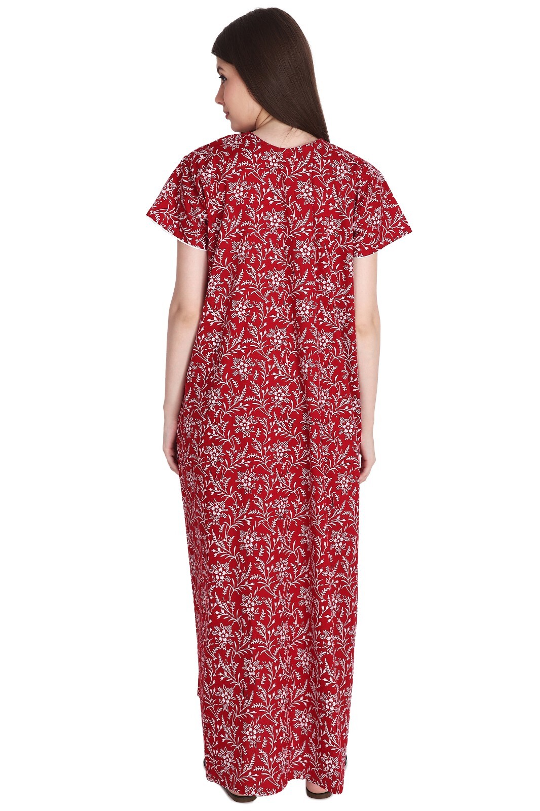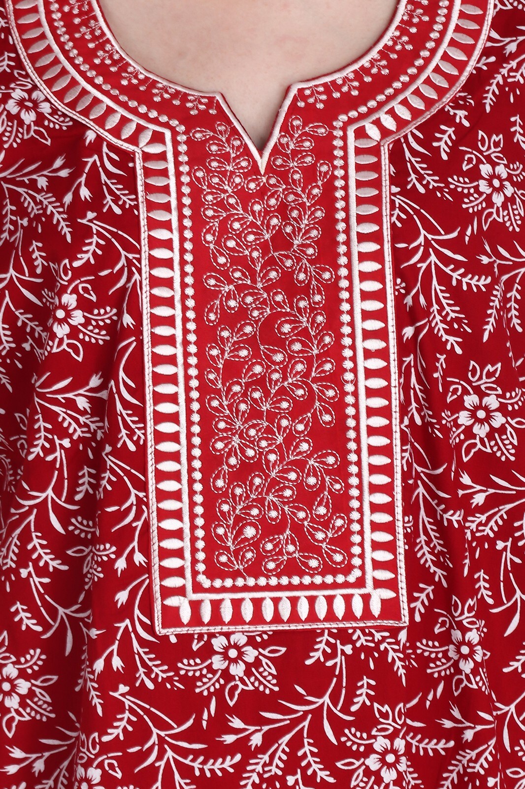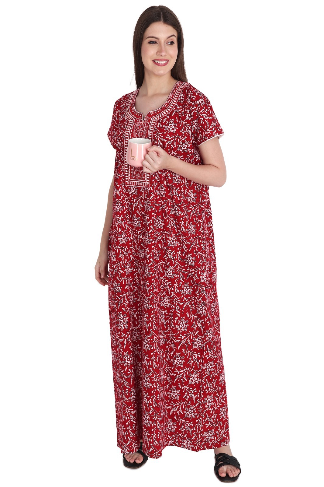 Indian Women's Red Cotton Embroidery Nighty for Girls Night Gown Embroidery Neck