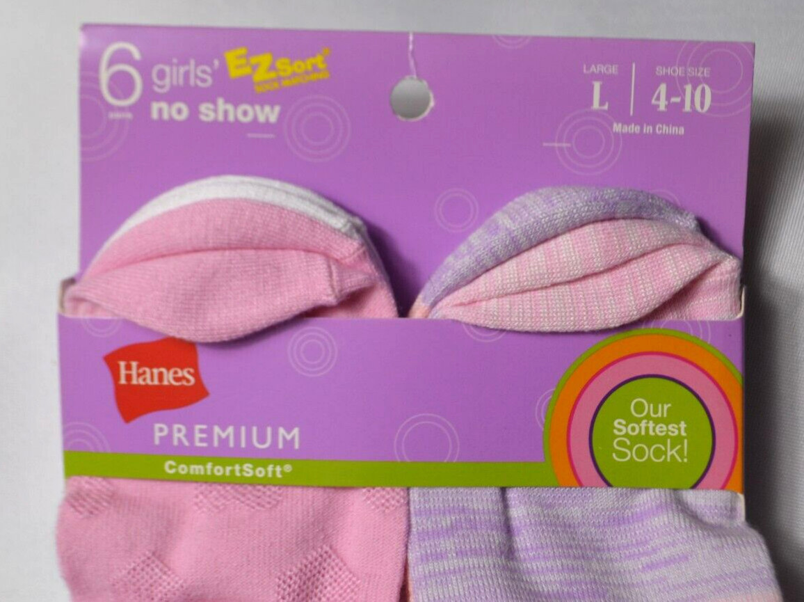 Hanes Girls No Show Socks 6 Pairs Large - Shoe Size 4-10 - NEW