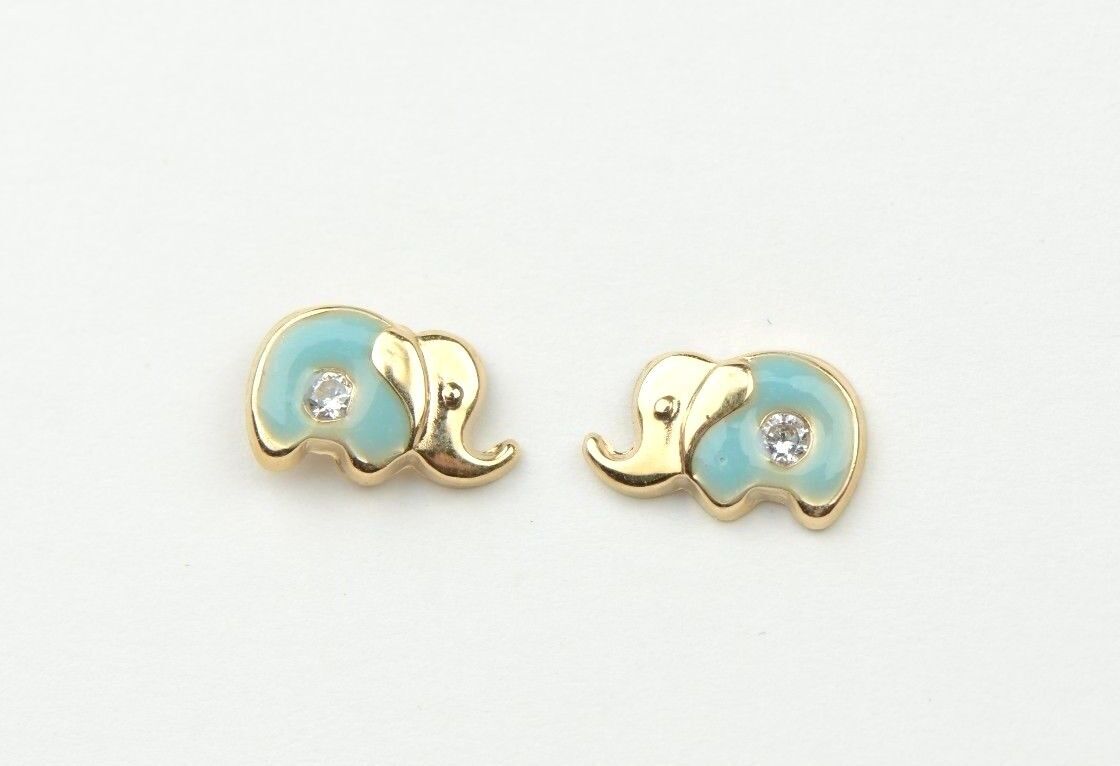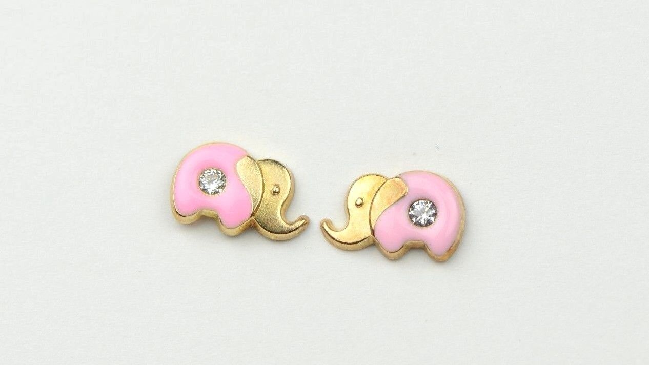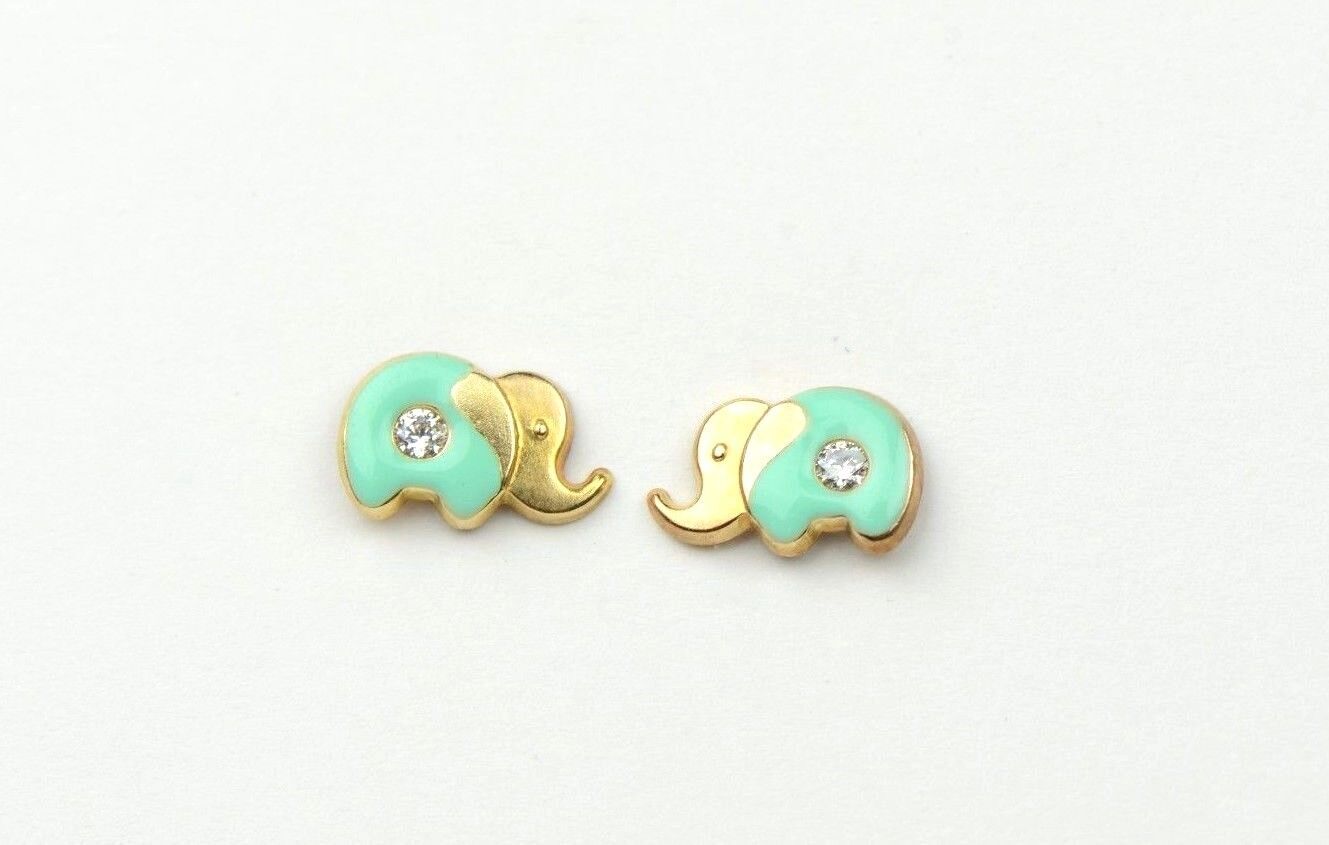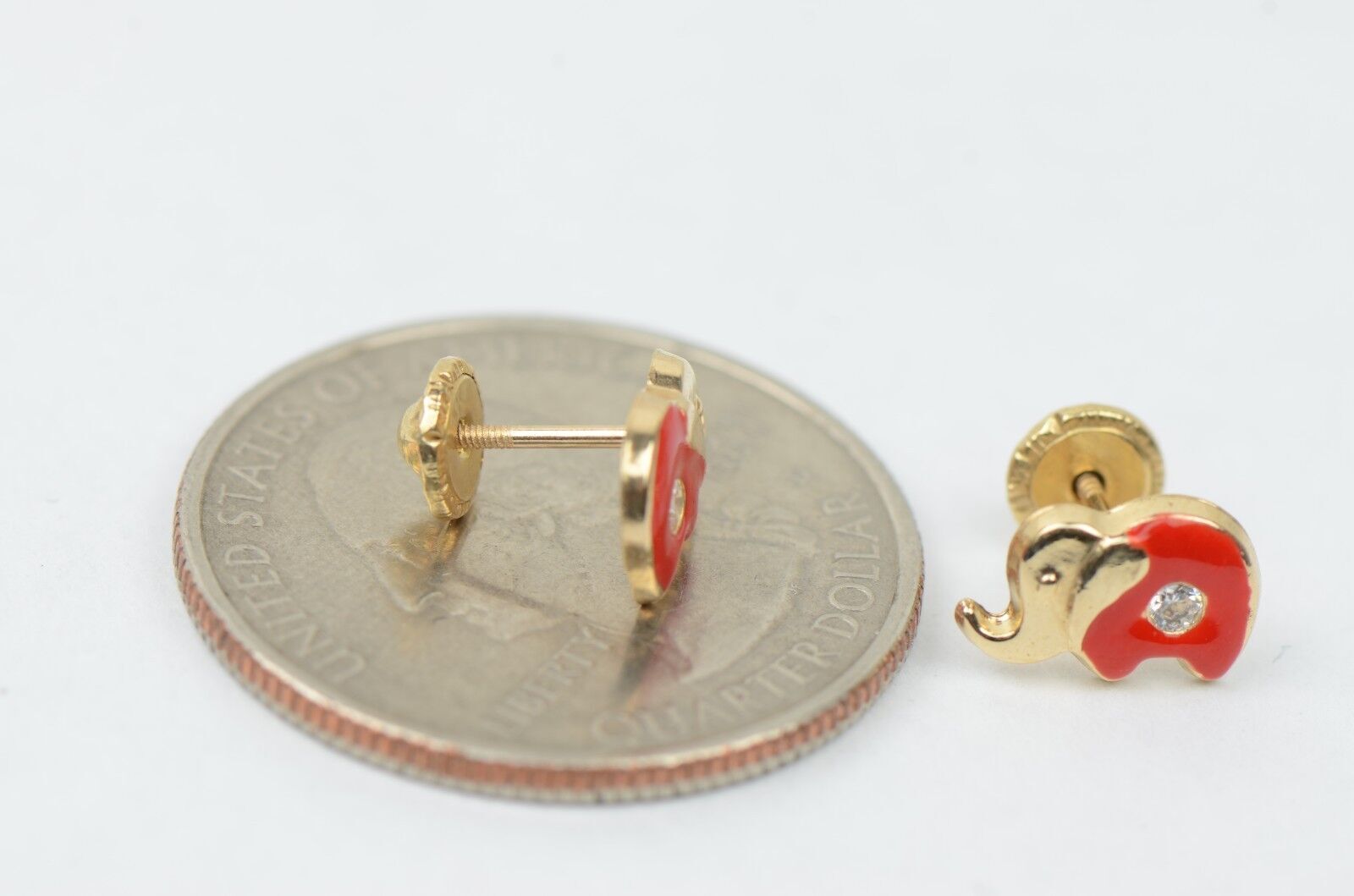 14k Yellow Gold Baby Enamel and CZ Elephant earrings, Screw Back