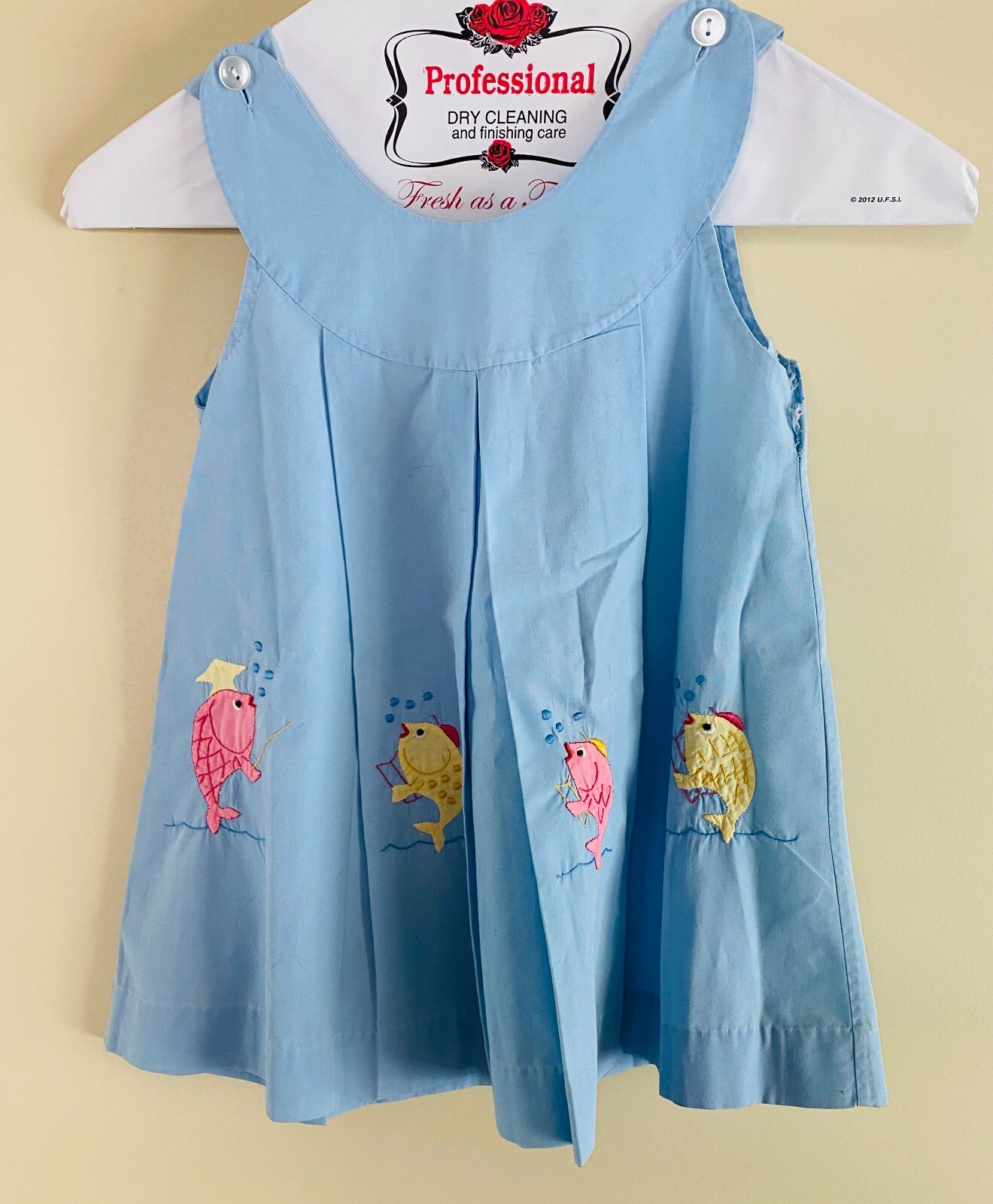 Vintage Blue Pleated Baby Summer Dress Girls Cotton Hand Made Fishes 3