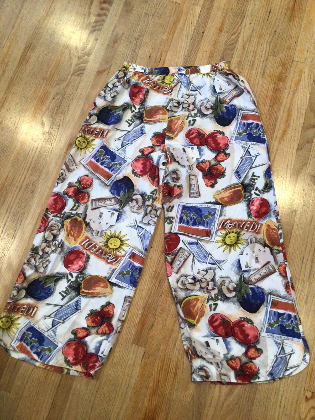 Vintage 80 s Paris Blues Rayon Colorful Boho Travel Print Crop Pants Size Large