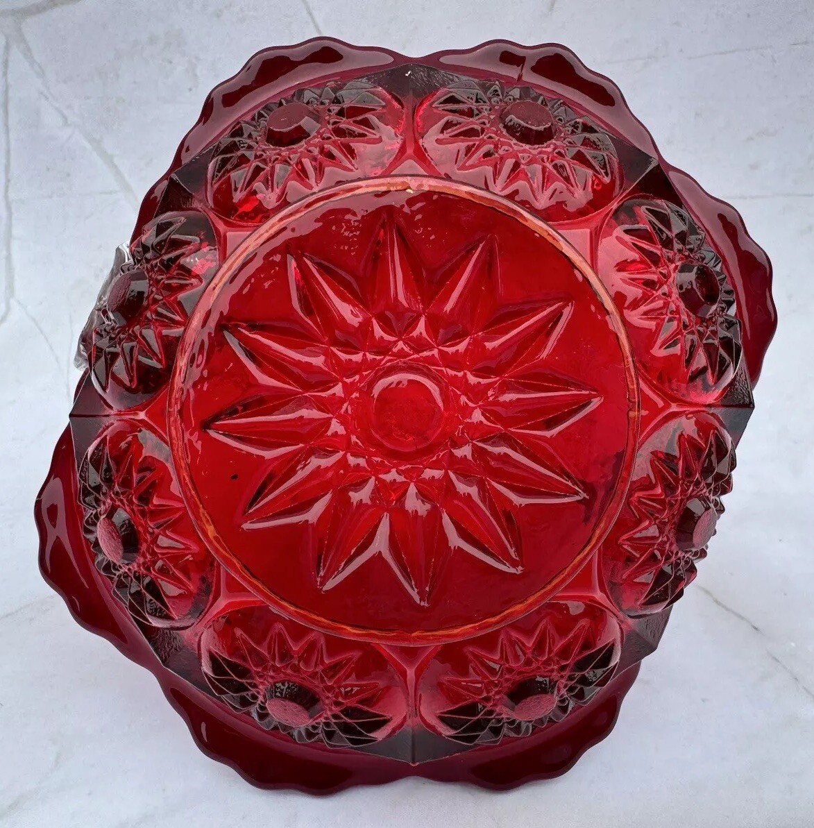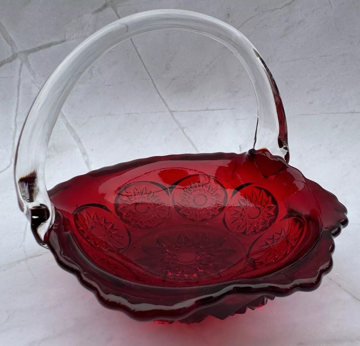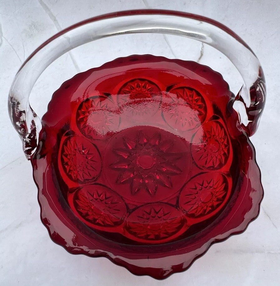 как выглядит Vintage Ruby Red Glass Basket With Clear Handle Ruffle Crimped Edge Cut Pattern фото