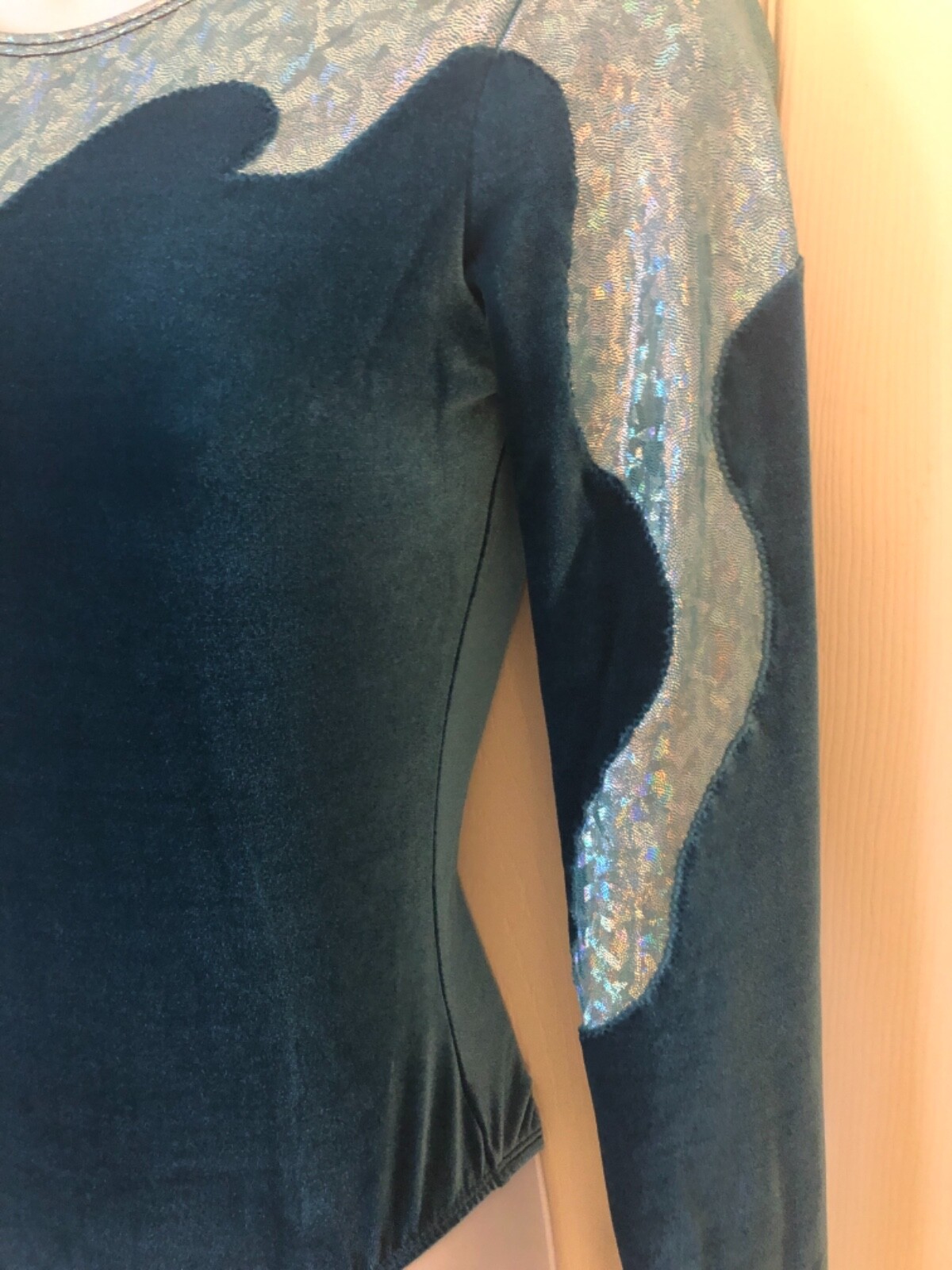 как выглядит GK LgSLV LADIES SMALL GREEN VELVET AQUA FOIL GYMNASTIC DANCE LEOTARD Sz AS NWT фото