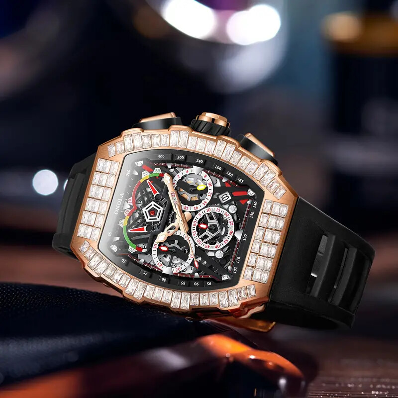 Men Luxury Watch Iced Bling Sports Baguette Stone Silicone Band Hip Hop Fashion