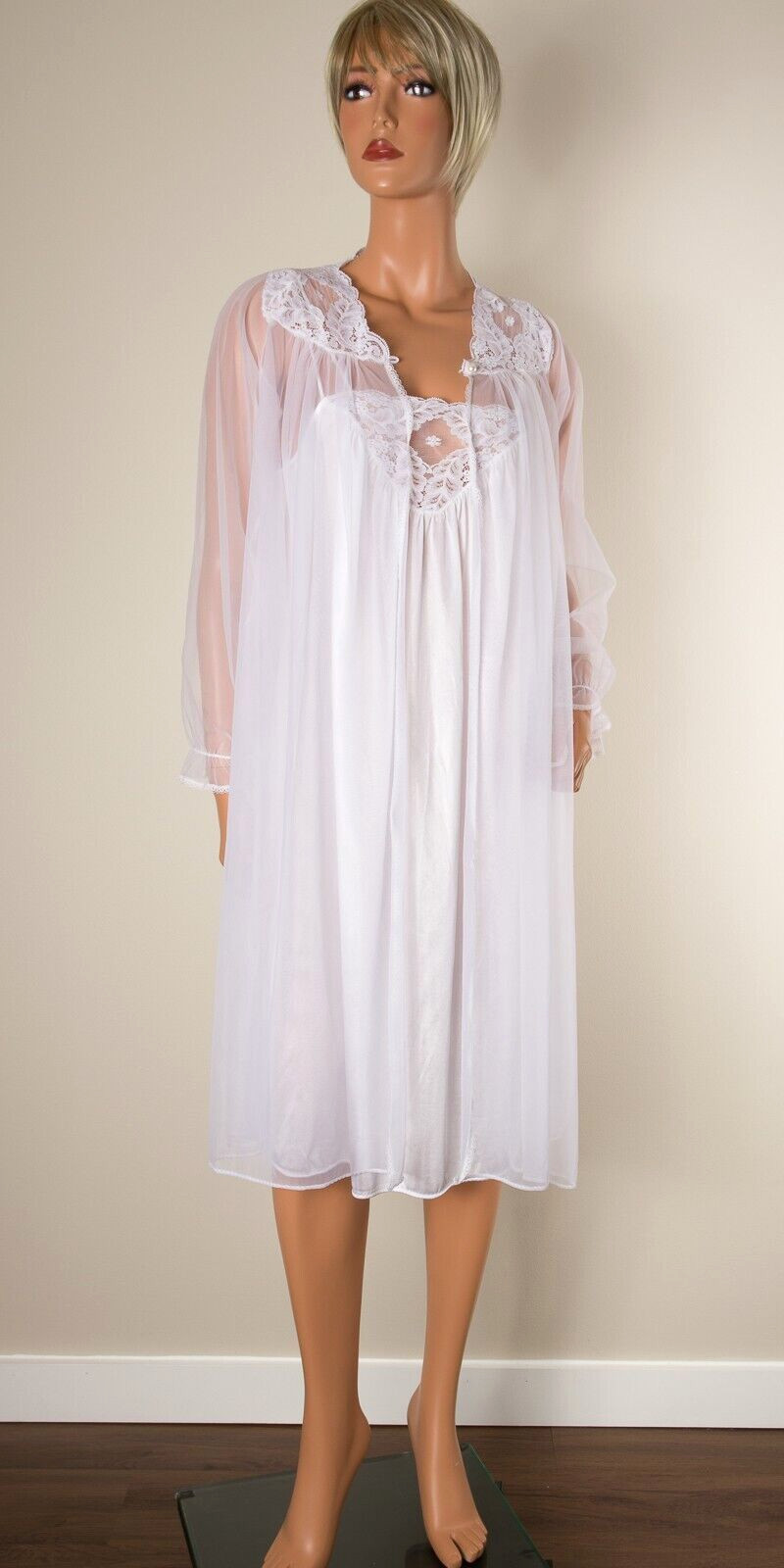 VTG KAYSER Bridal Chiffon Peignoir Nightgown Set White Robe Negligee Lace S