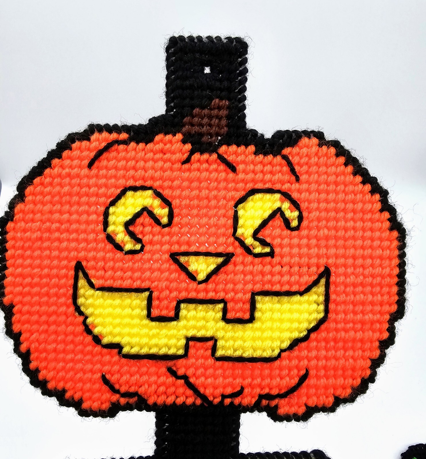 • Vintage Needlepoint On Canvas Halloween Jack-O-Lantern Lantern Black Cat