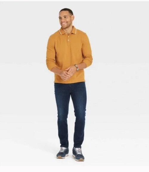 Goodfellow Mens Long Sleeve Rugby Polo Shirt S Harvest Gold Mustard Stripe NEW