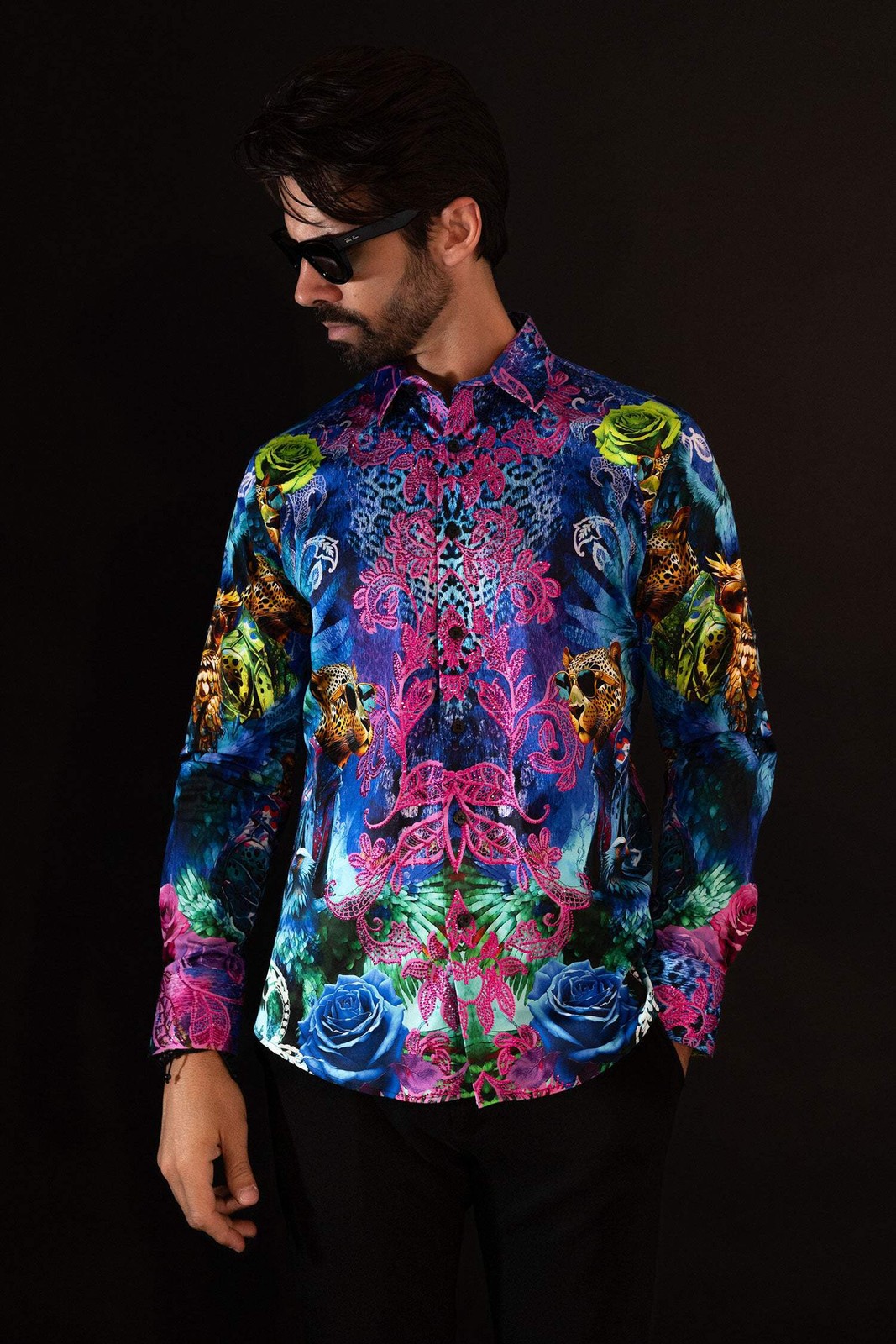 BARABAS Men's Rhinestone Rose Owl Eagle Long Sleeve Shirts 4SPR06