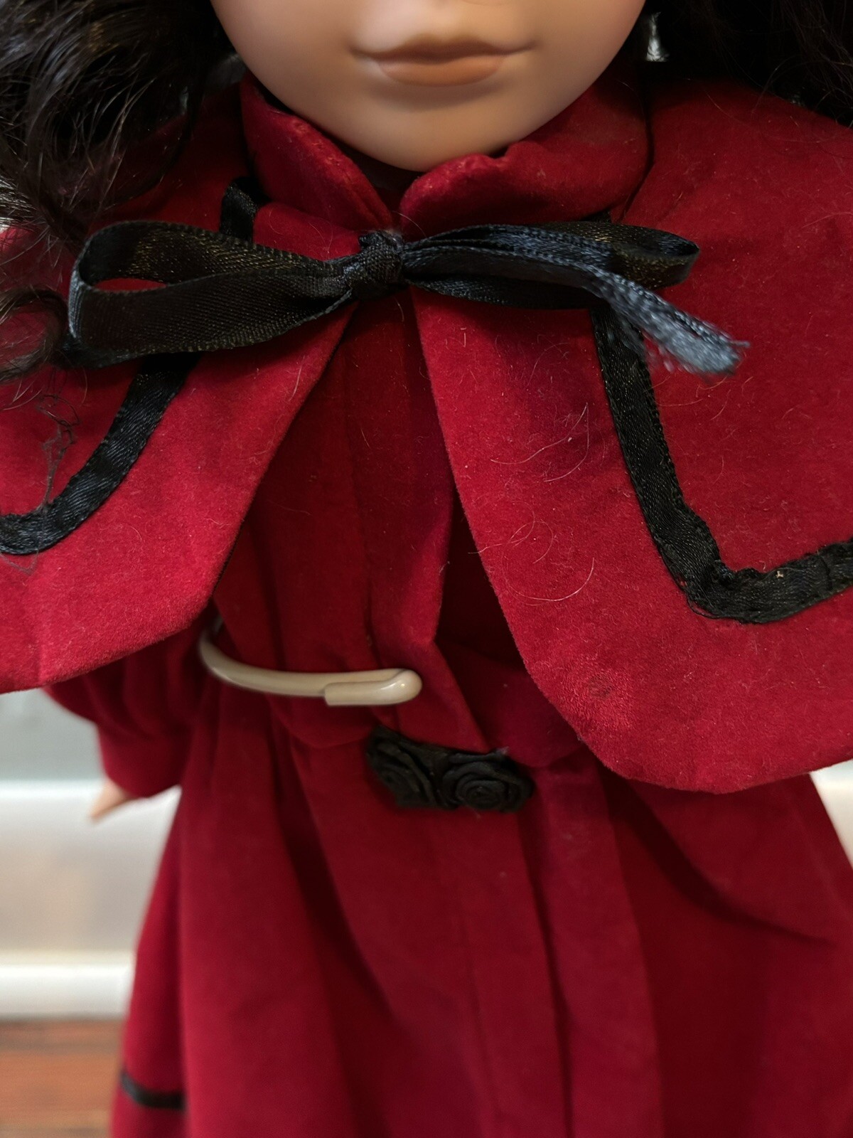 как выглядит 16" Limited Collection vintage porcelain doll with red dress curly brown hair фото