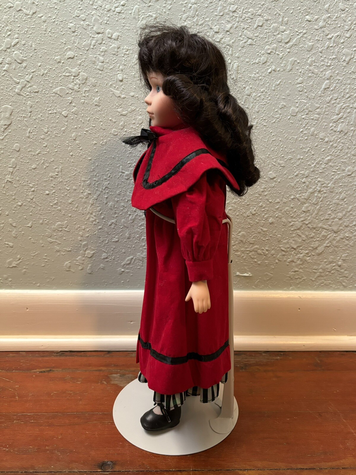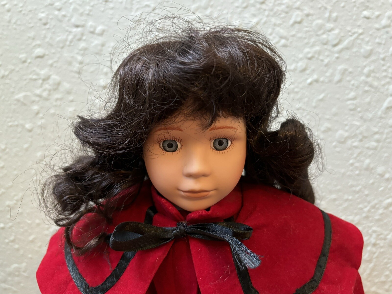 16 Limited Collection vintage porcelain doll with red dress curly brown hair