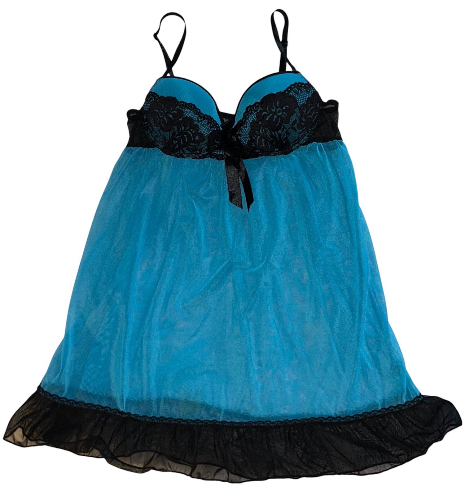 PER LEI Blue Silky Sheer Black Lace Trim Nightie Nightgown Womens L
