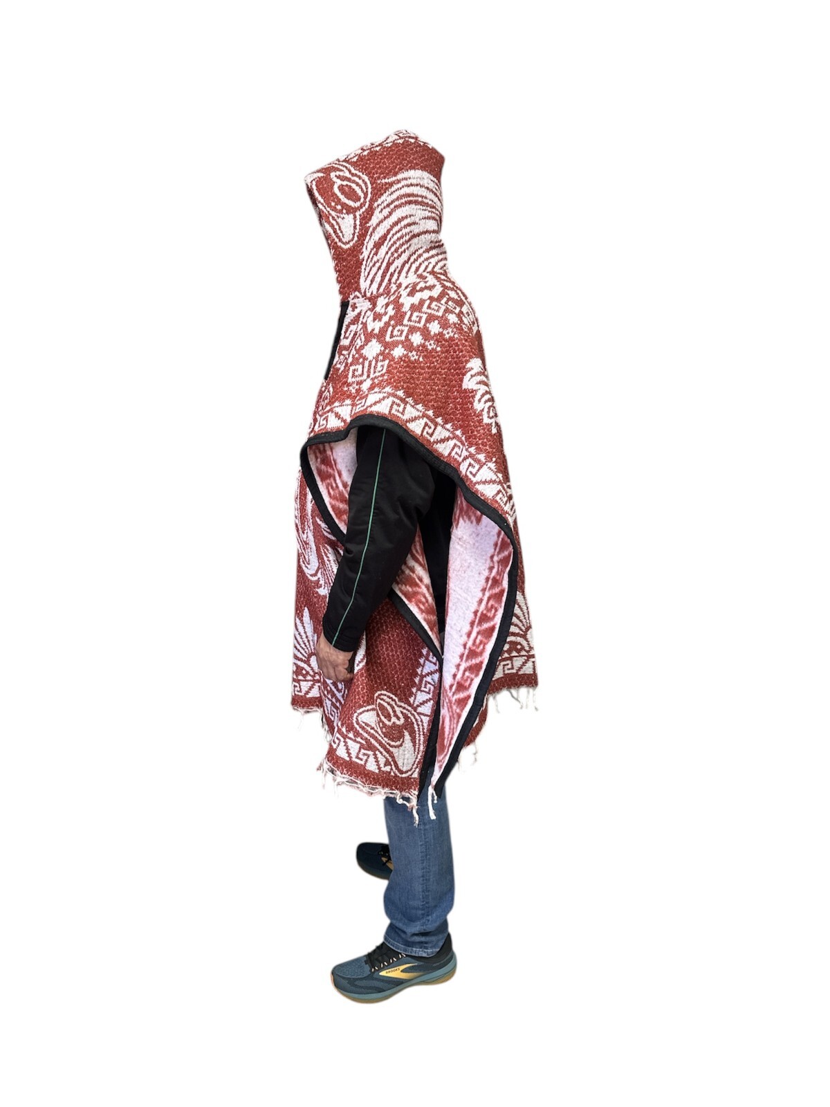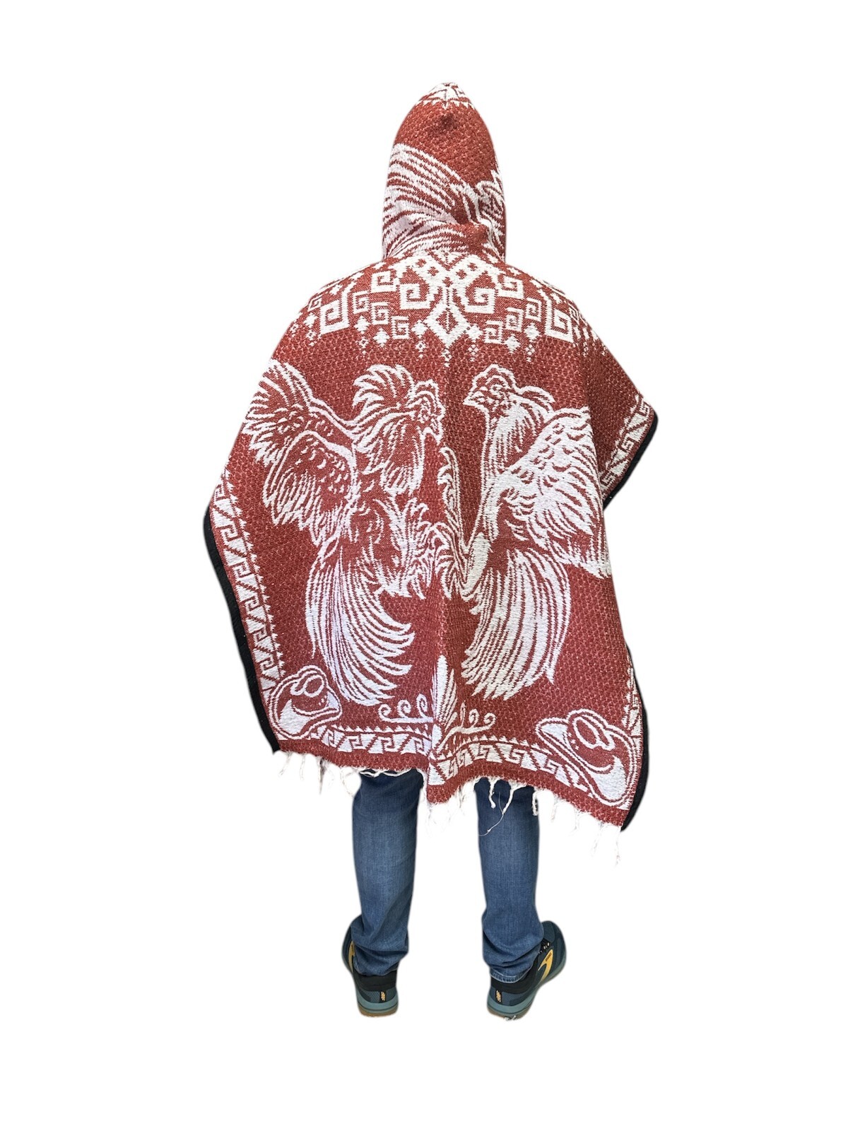 как выглядит MEXICAN PONCHO WITH HOOD , PELEA DE GALLOS , ROOSTER , OVERSIZED, TERRACOTTA фото