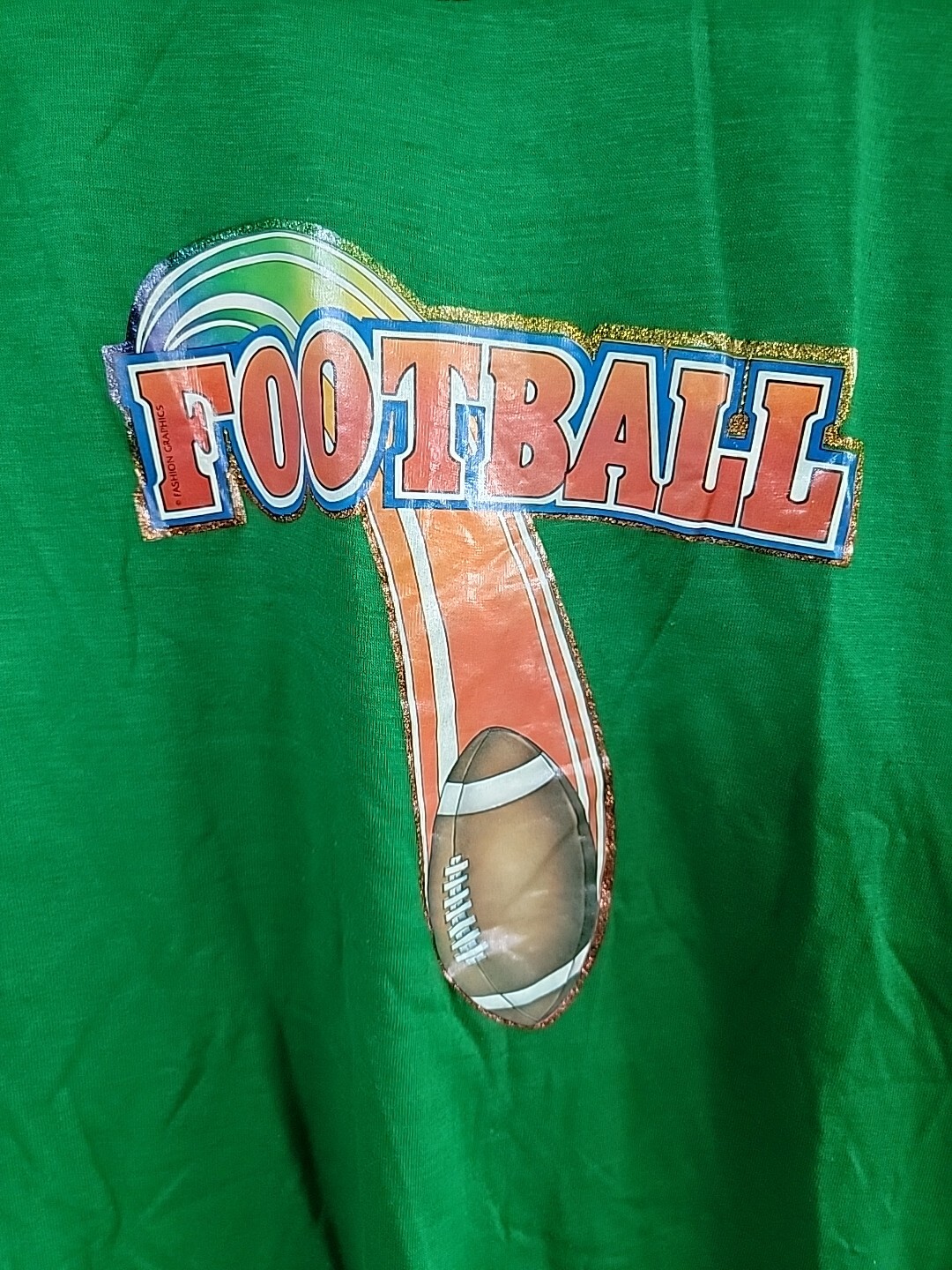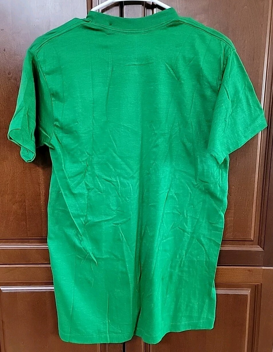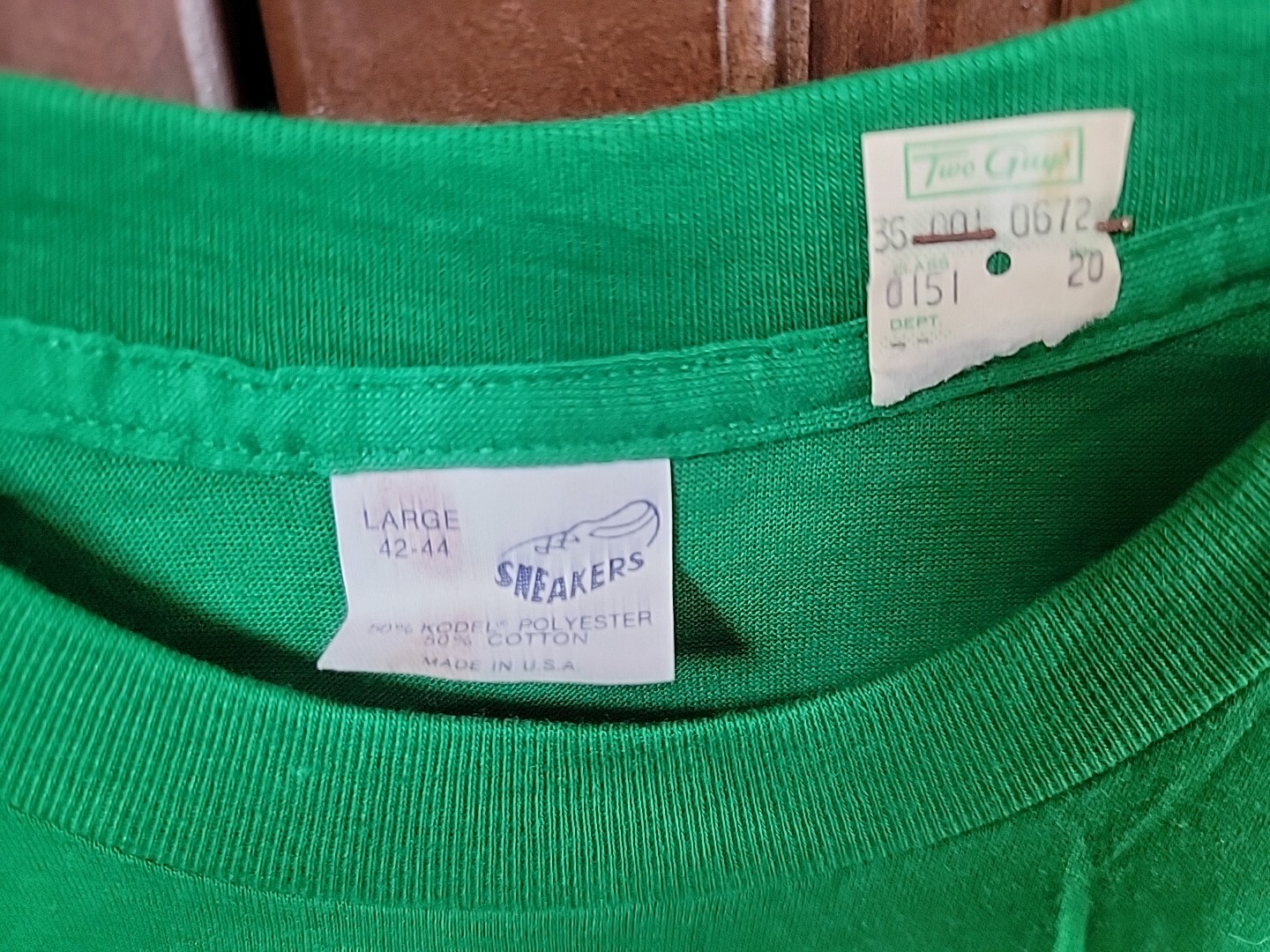 как выглядит Vintage 1980s Sneaker Label L T-Shirt GREEN FOOTBALL TWO GUYS TAG фото