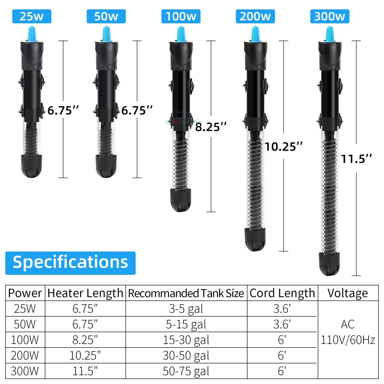 Aquarium Heater 25-300W Adjustable Fish Tank Heater with Sticker Thermometer