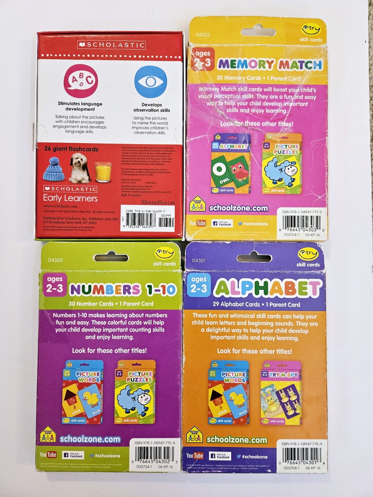 Lot 4 Scholastic First Words School Zone ABC's Numbers Memory Match Flashcards