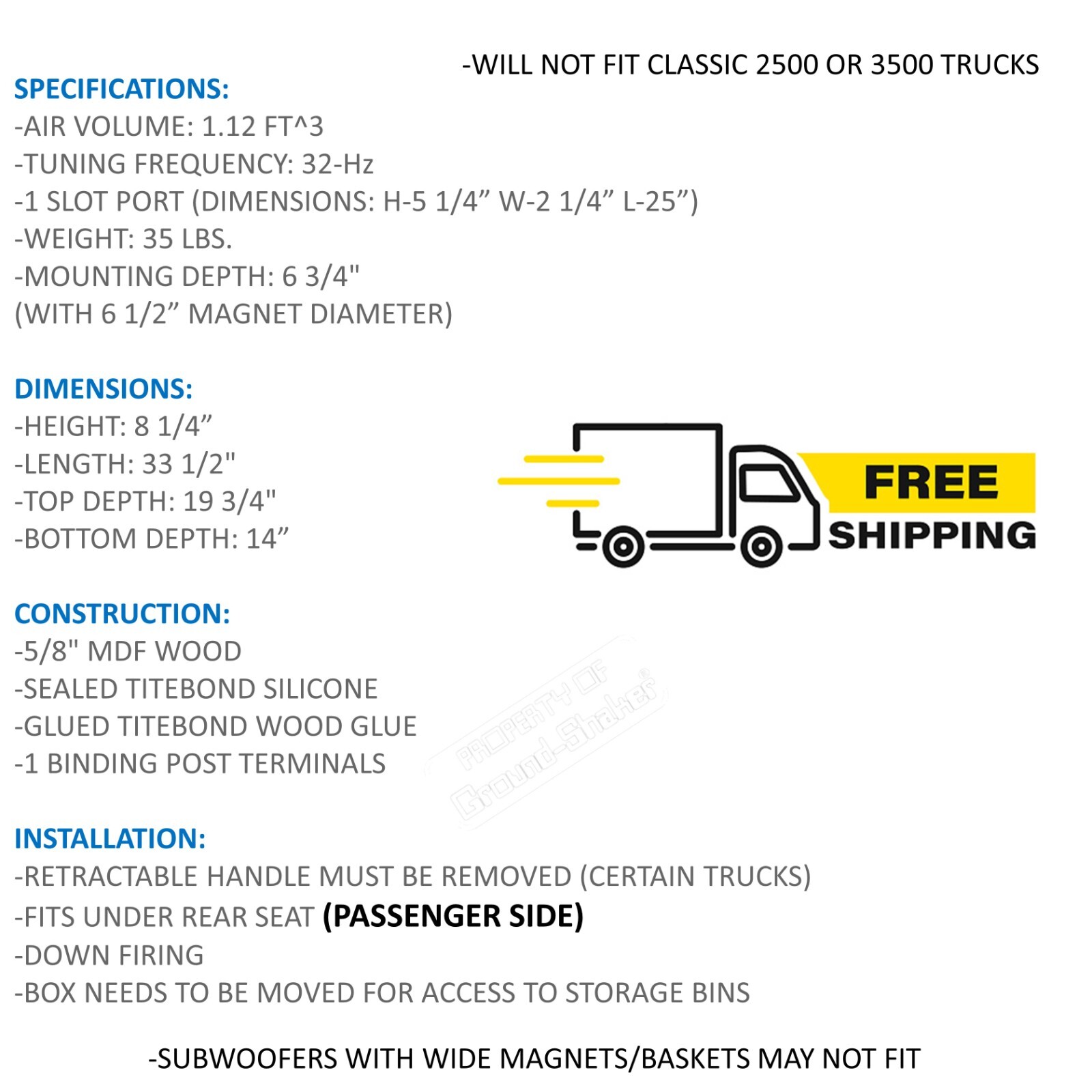 Dodge Ram Crew Cab 1500 2019 - 2024 Single Ported Sub Box Subwoofer Enclosure