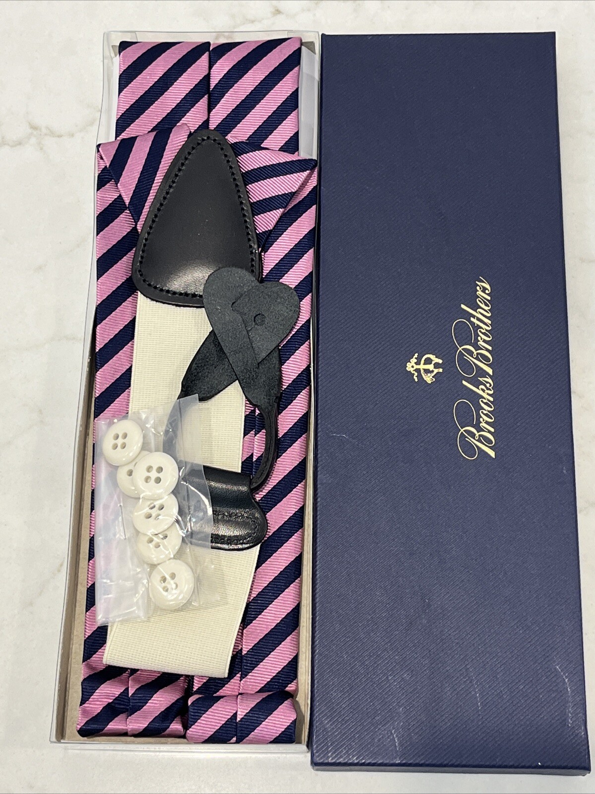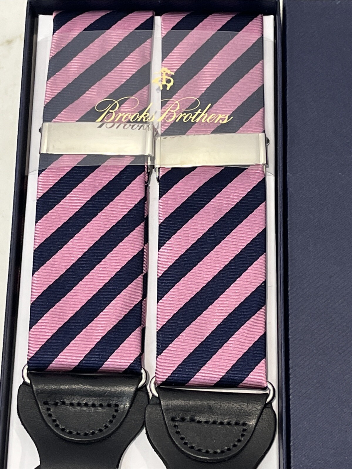 Brooks Brothers Pink Navy Diagonal Stripe Suspenders Braces Silk Leather Silver
