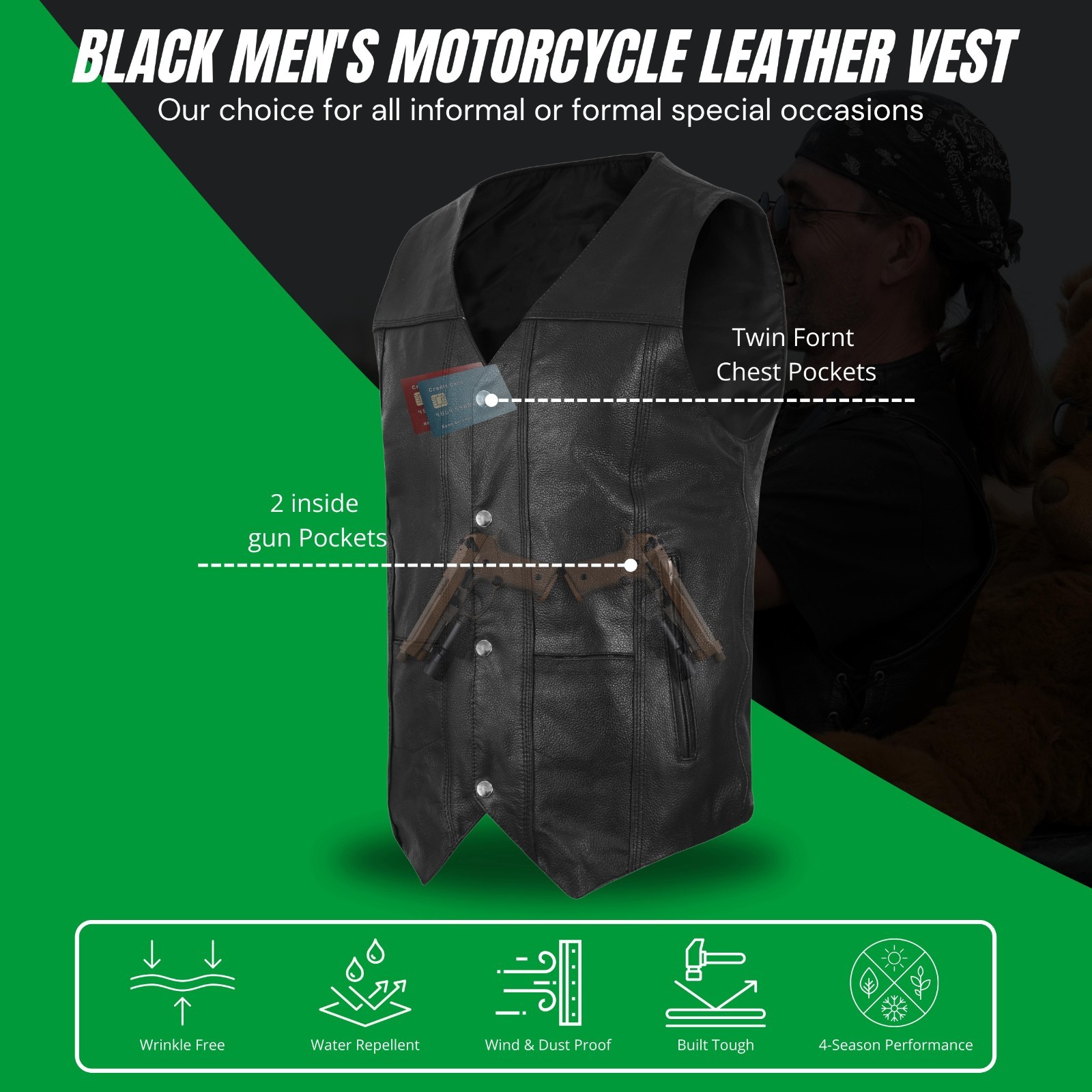 как выглядит Mens Black Classic V-Neck Leather Motorcycle Vest Biker Rider Apparel Gear фото