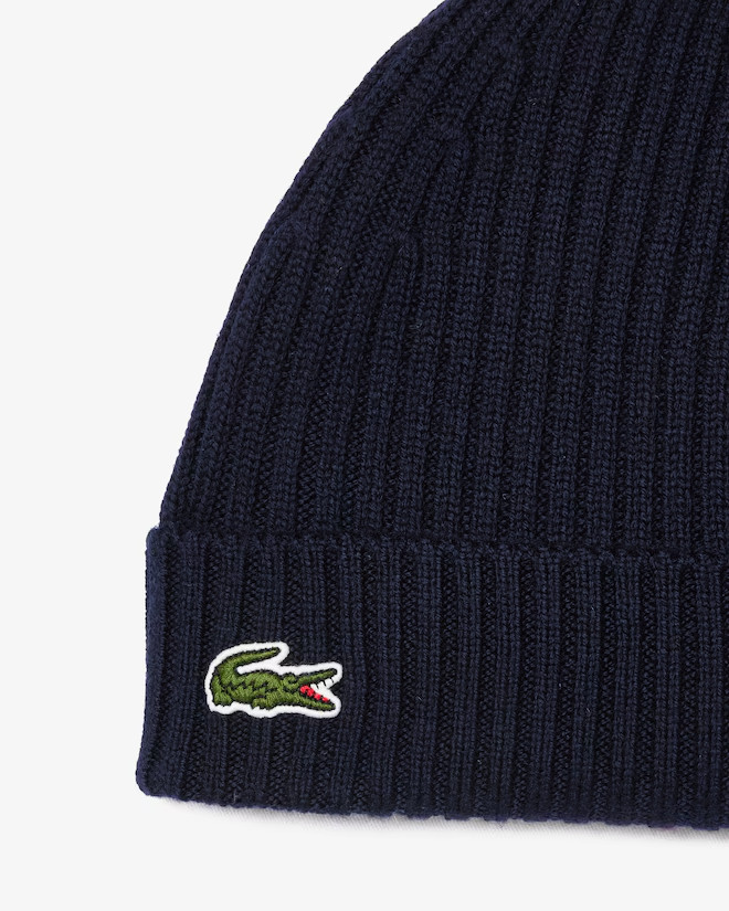 как выглядит LACOSTE Kids Unisex Rib Knit Wool Beanie Navy/Gray RB2569-51 фото