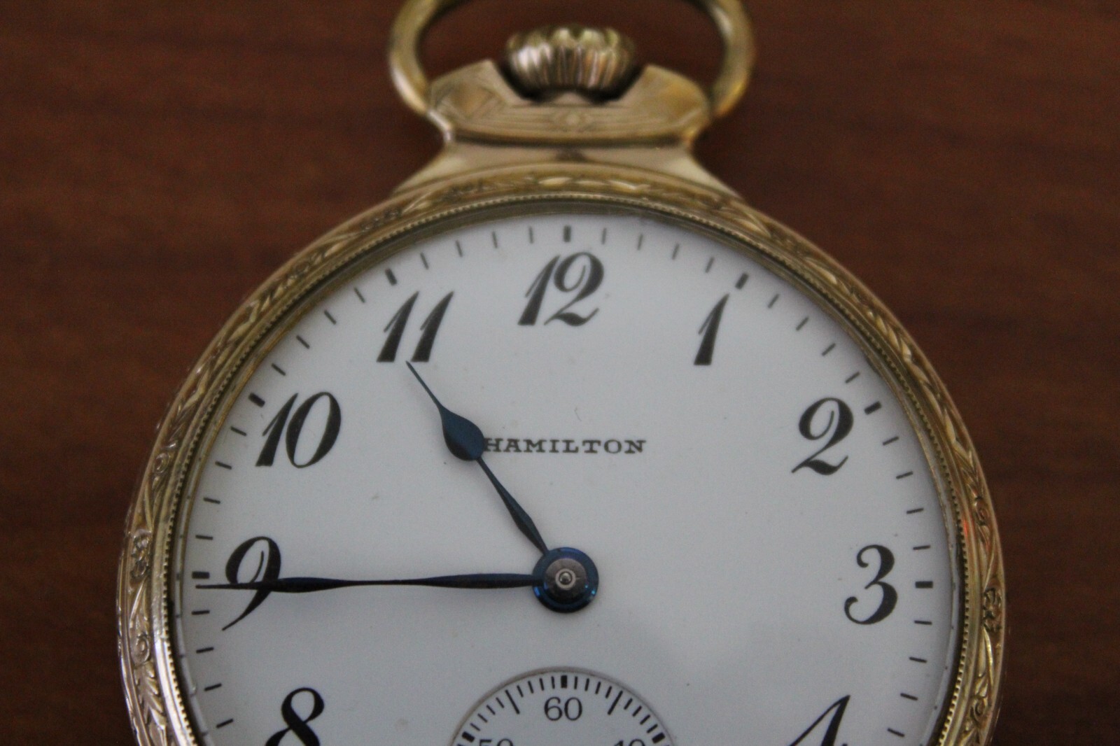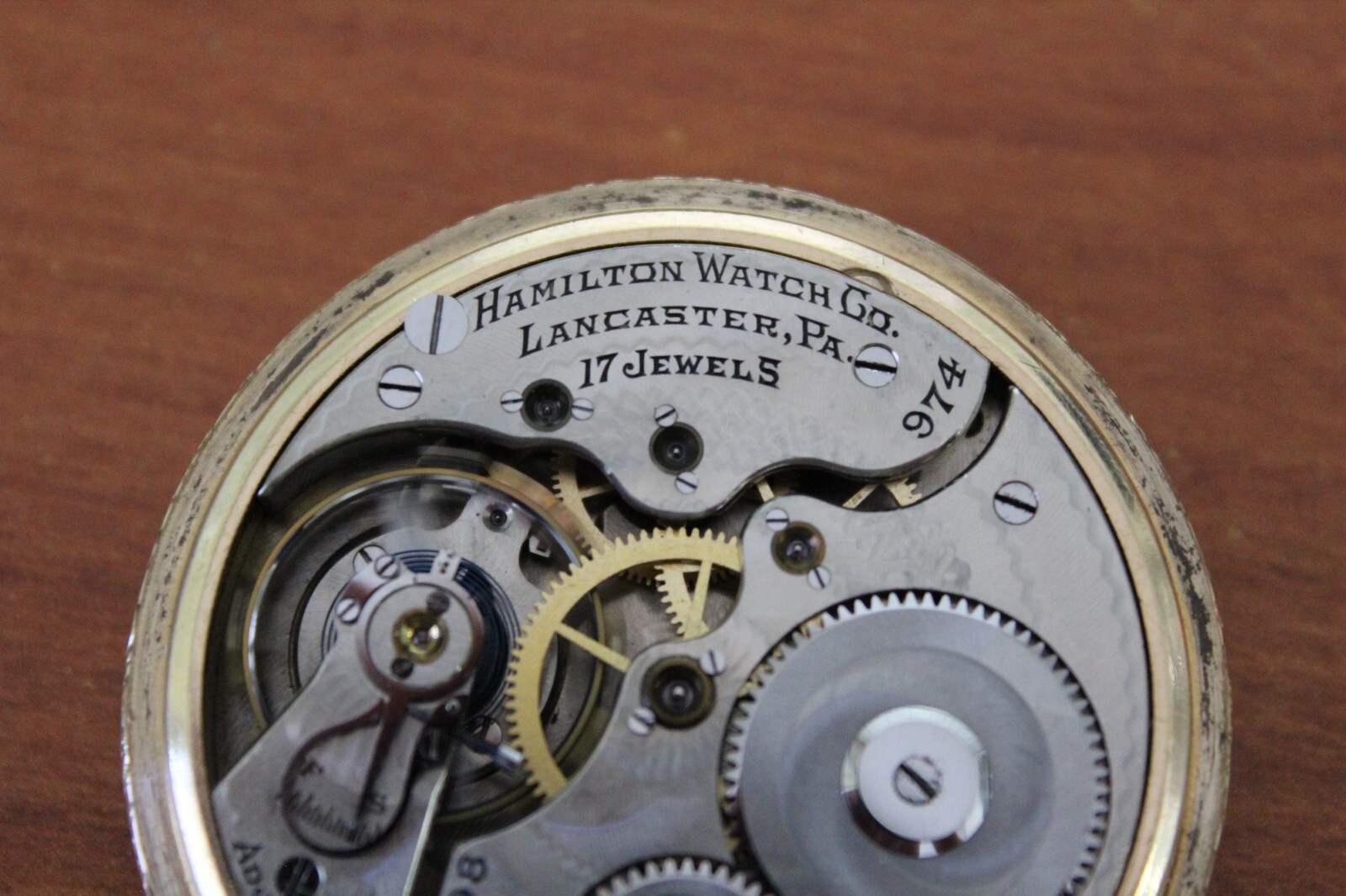 как выглядит 1922 Hamilton Grade 974 Model 2 16s 17j 14K Gold Filled Case Pocket Watch RUNS фото