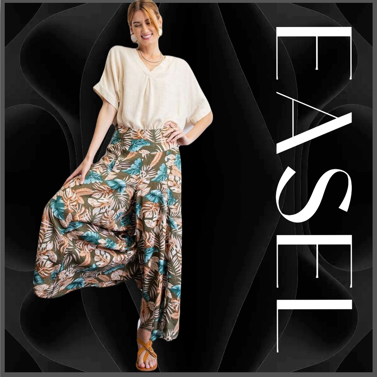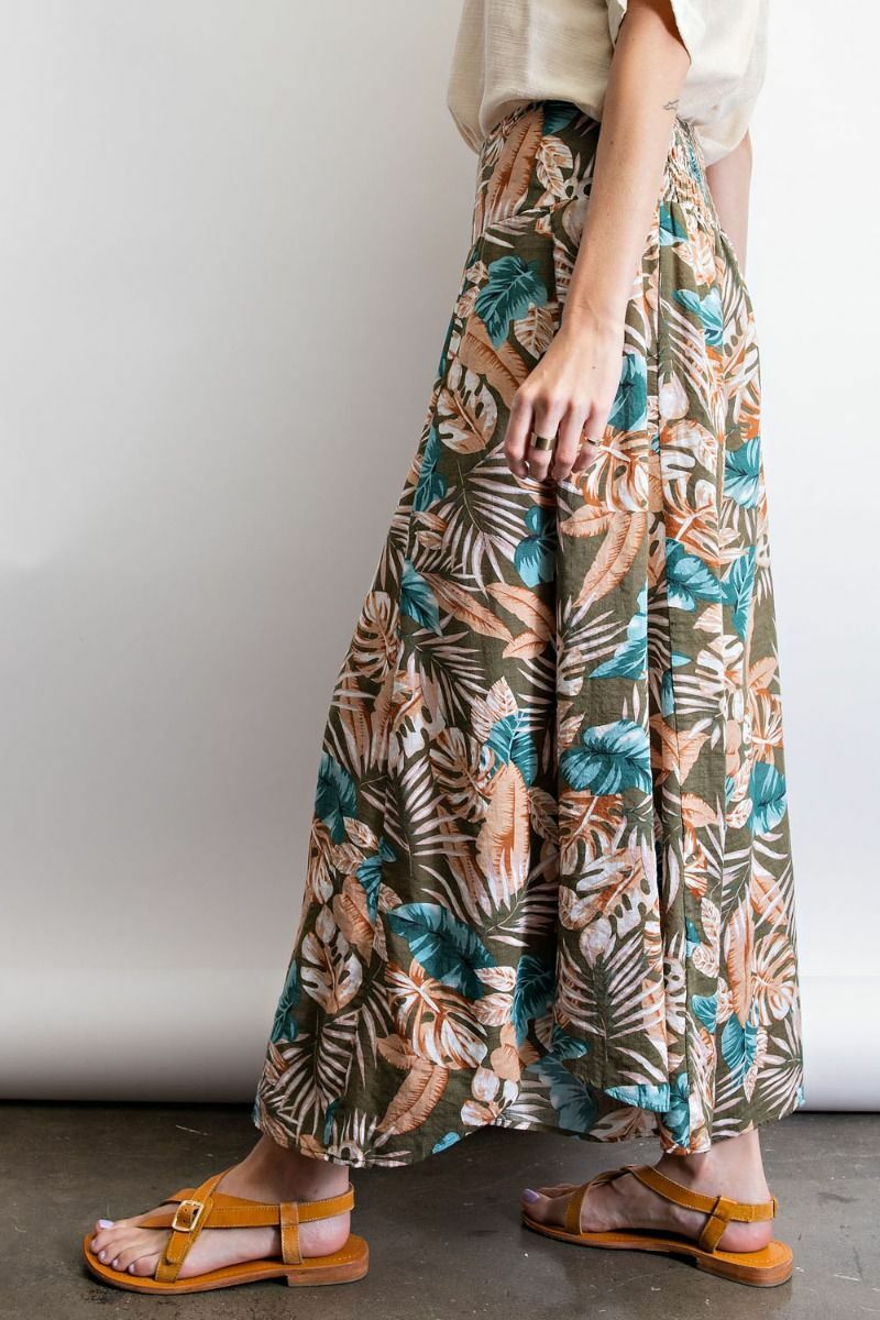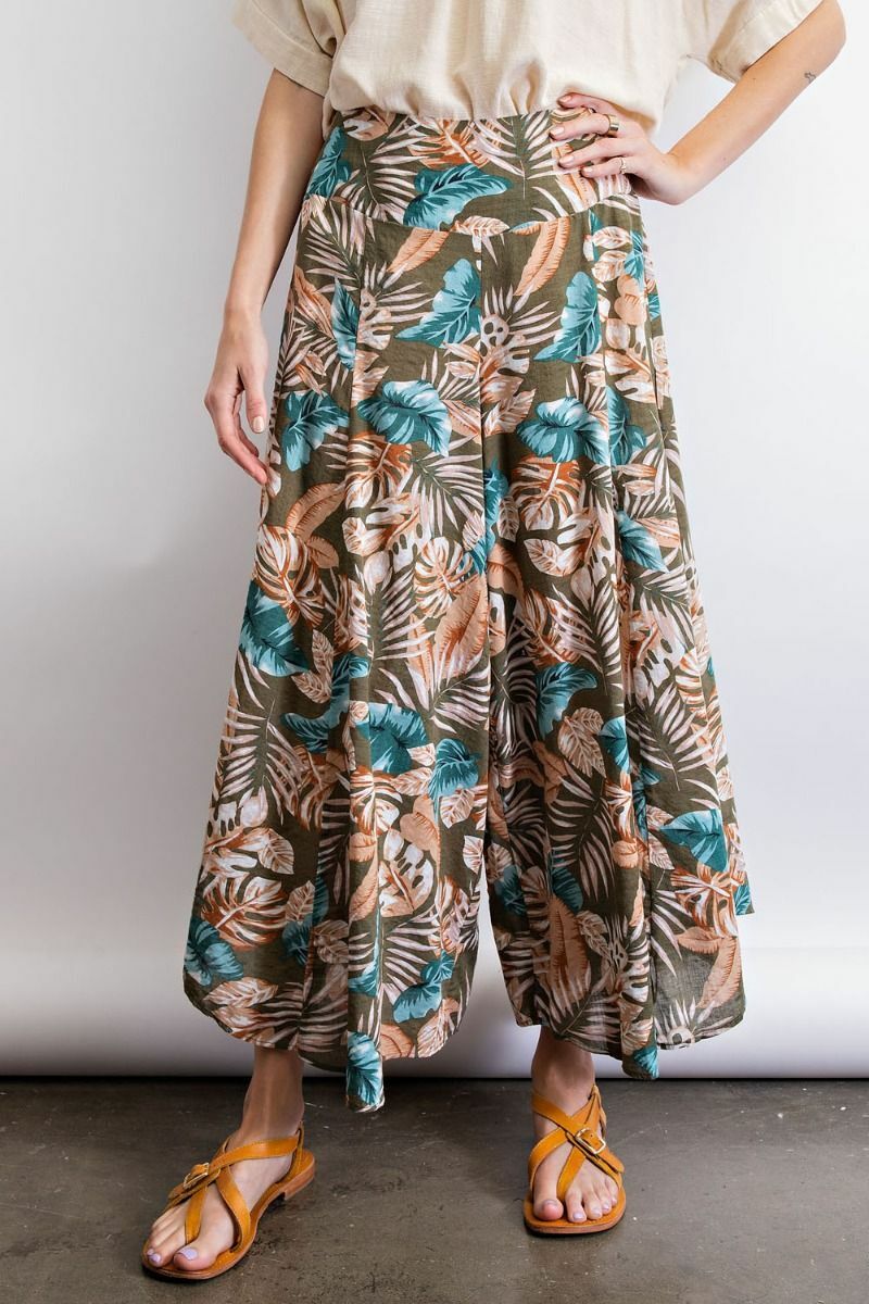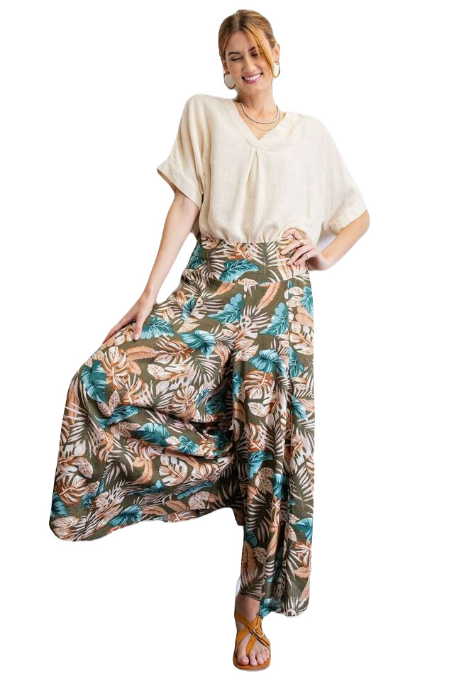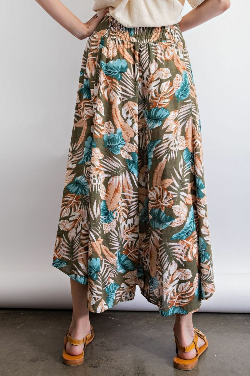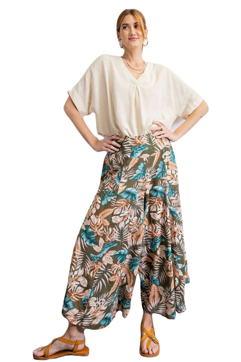 SIZE S/M EASEL OLIVE GET AWAY TROPICAL PRINT WIDE LEG PANTS BHCS