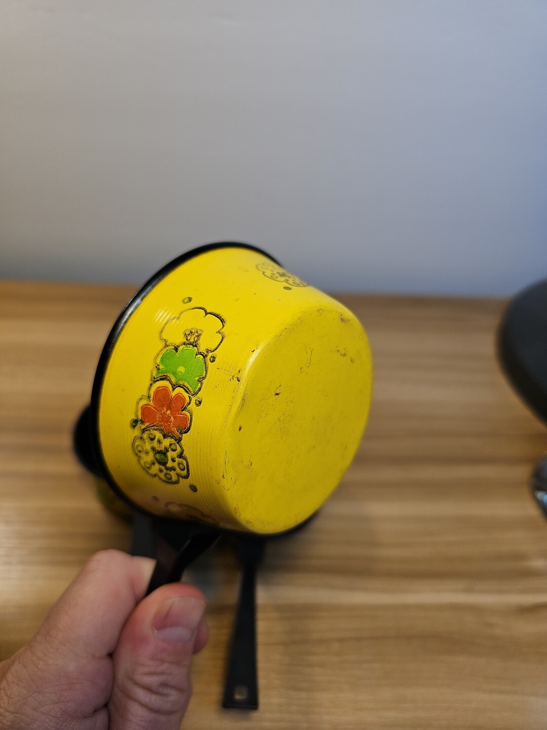 как выглядит 3 Vintage Children s Metal Pots/Pans Set 1970 s фото