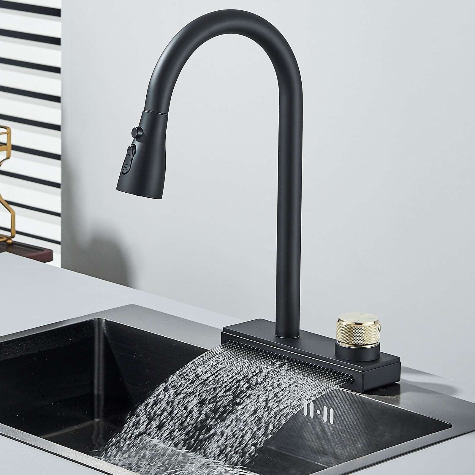 Black Commercial Kitchen Sink Faucet Pull Down Sprayer Rain Waterfall Mixer Tap