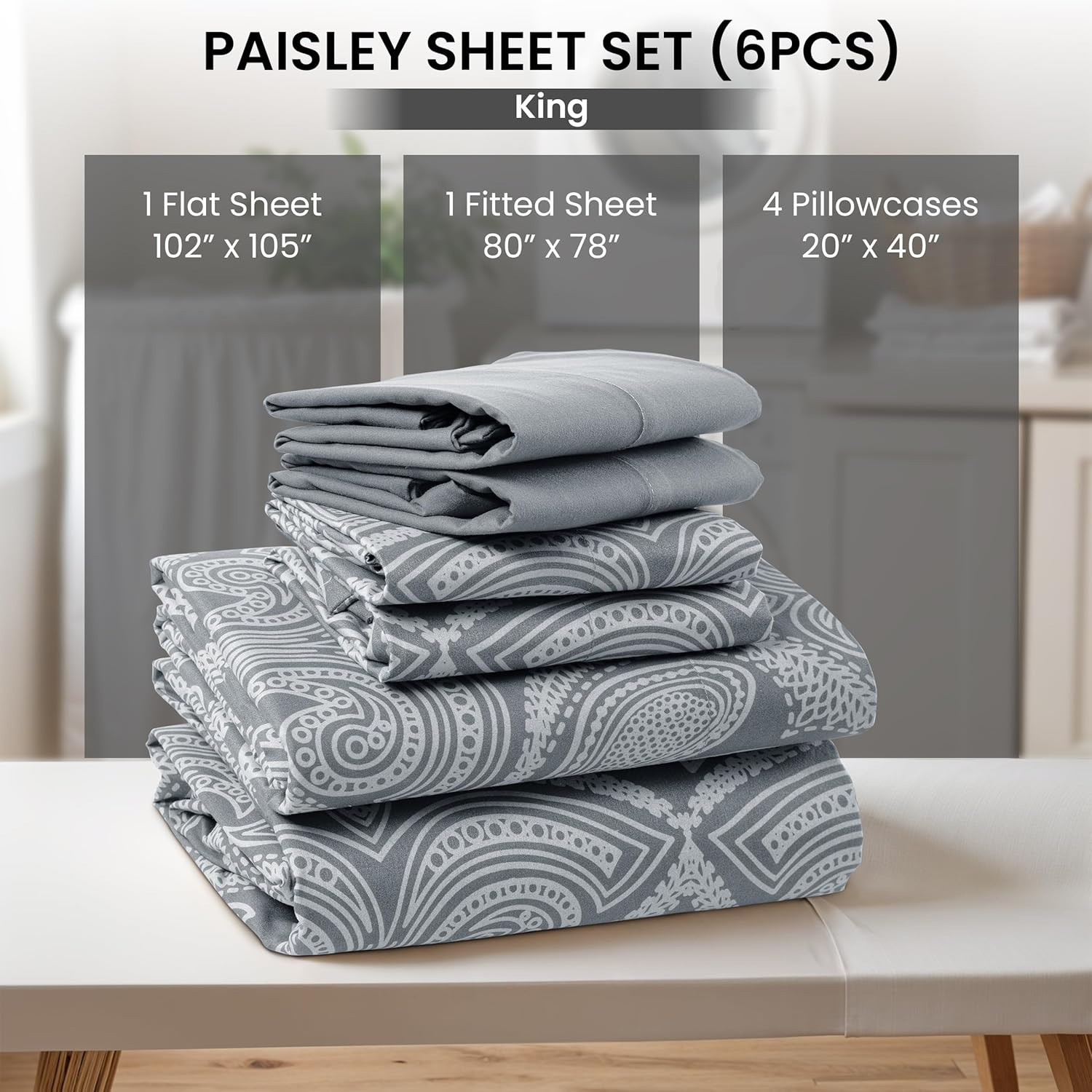 LDC Paisley King Sheet Set, 6 PC Soft Microfiber Wrinkle Free Sheets - Luxurious