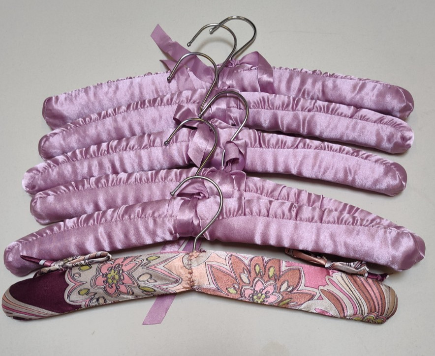 6 Vintage Satin Cloth Padded Coat Hangers. purple