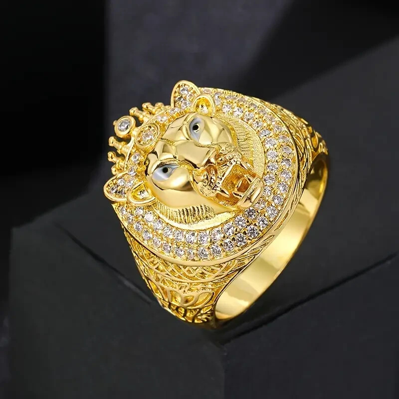 Men's Iced Lion Head Pinky Ring 18K Gold Plated Bling CZ Vintage Style Size 8 12