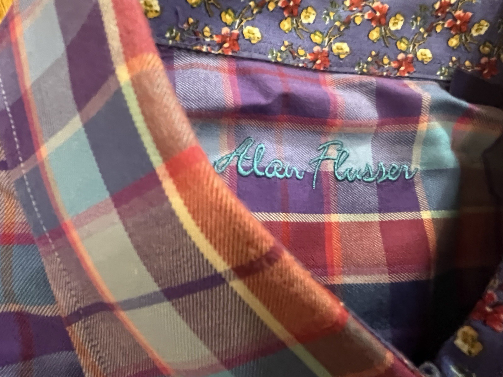 как выглядит Alan Flusser Long Sleeve Cotton Shirt Plaid w/Contrasting Floral Cuffs Men