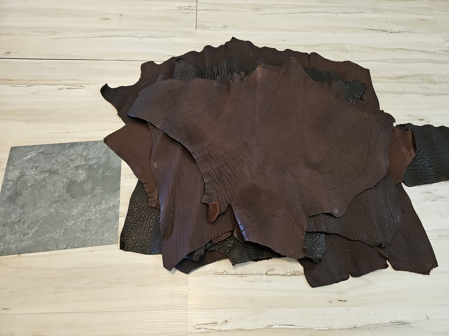как выглядит 6-8 oz BROWNs BLACK FULL GRAIN 5pc SET 20 sqf LEATHER HIDE SHEET,PANEL,SHEATHS фото