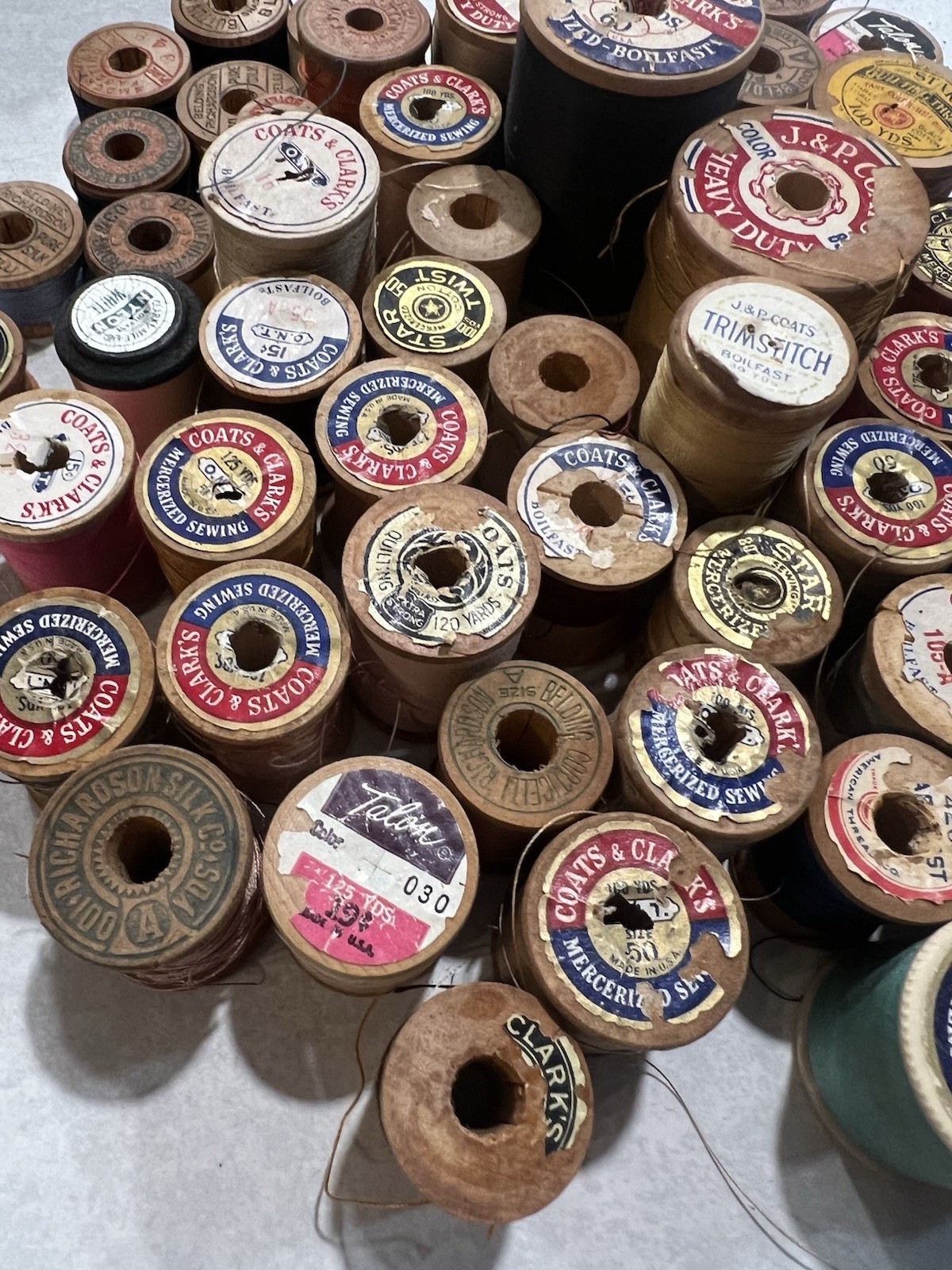 Lot Of 59 Antique Wooden Thread Spools Coats And Clark Belding Heminway Silk