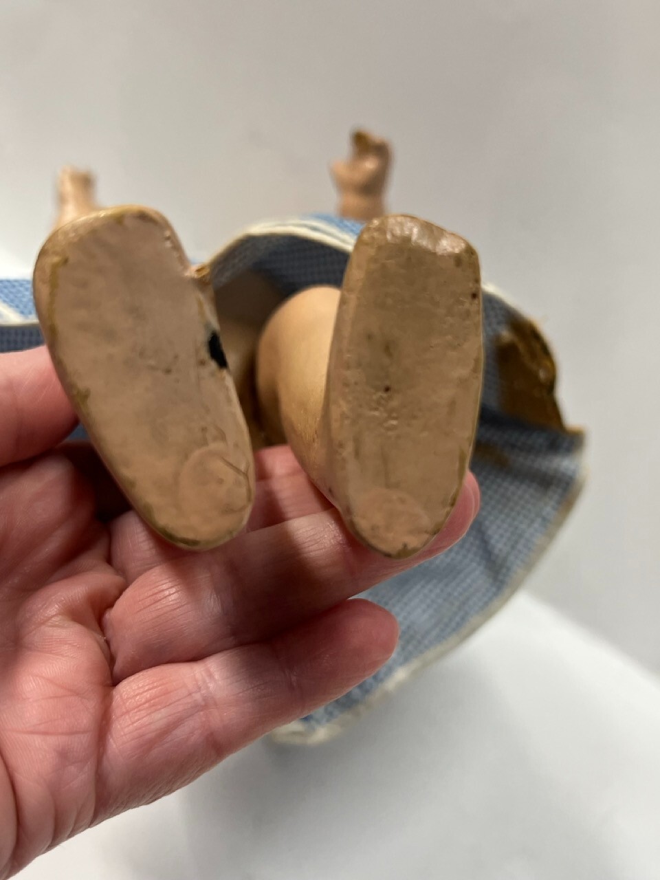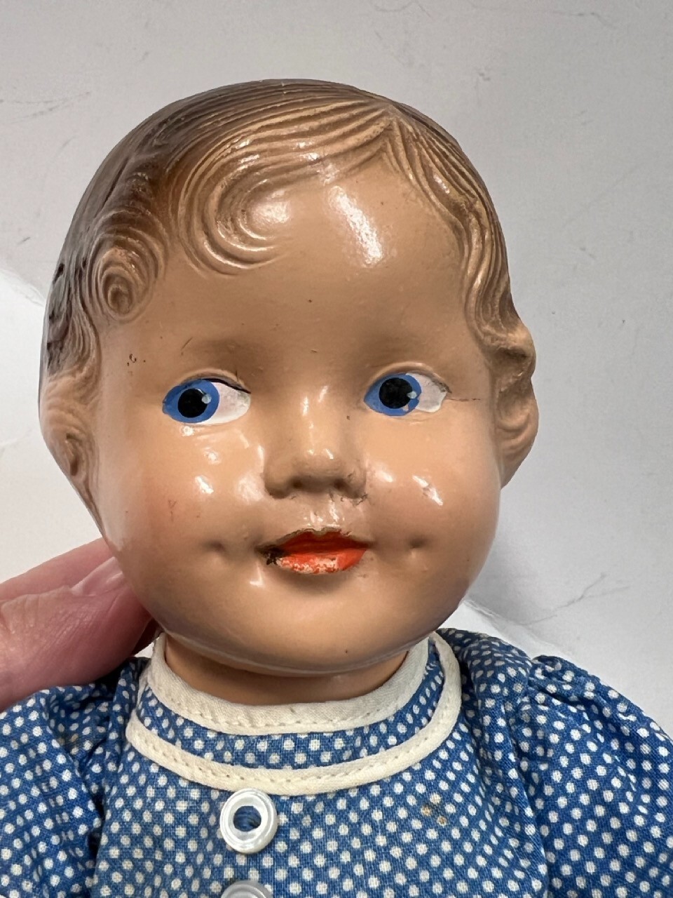 как выглядит Vintage Antique Jointed Schildkrot German 11" Celluloid Doll Blue Dress фото