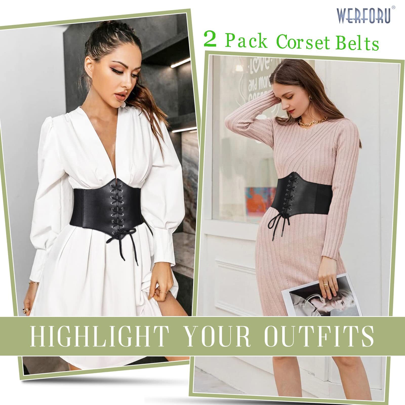 2 Pack Women's Black Corset Elastic Belt Wide Retro Lace-up Tied Waist Belt