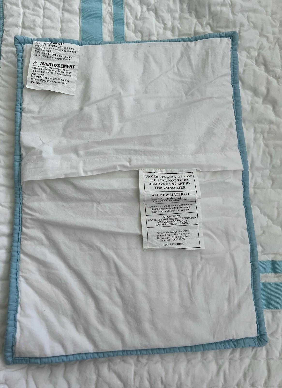 как выглядит Pottery Barn Kids Crib Quilt, Sham, Dust Ruffle Set Baby White with Blue Trim фото