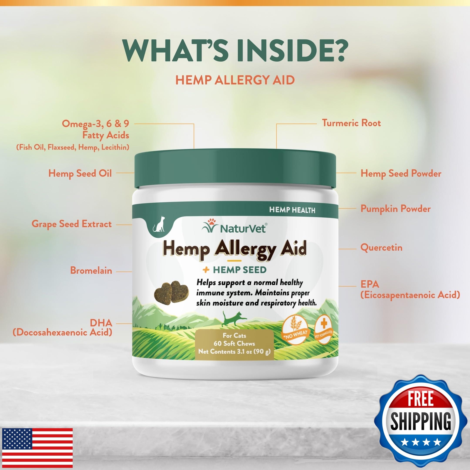 NaturVet Hemp Allergy Aid Plus Hemp Seed Soft Chews for Cats, 60 ct, Made in