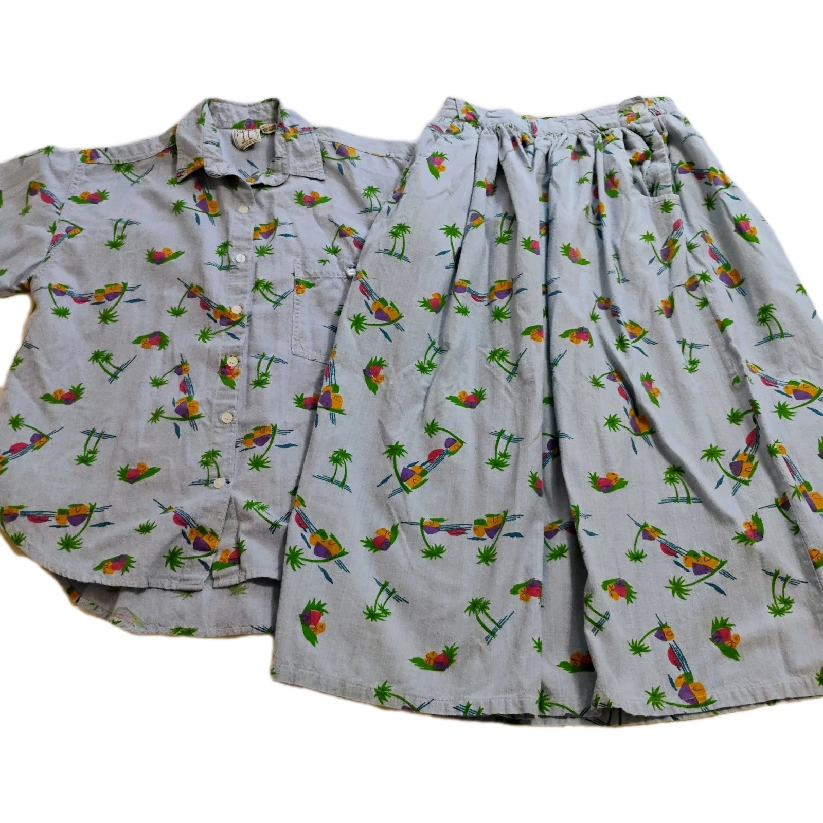 Vintage 80's Matching Midi Skirt Top Set Size Small Summer Beach Print Chez T