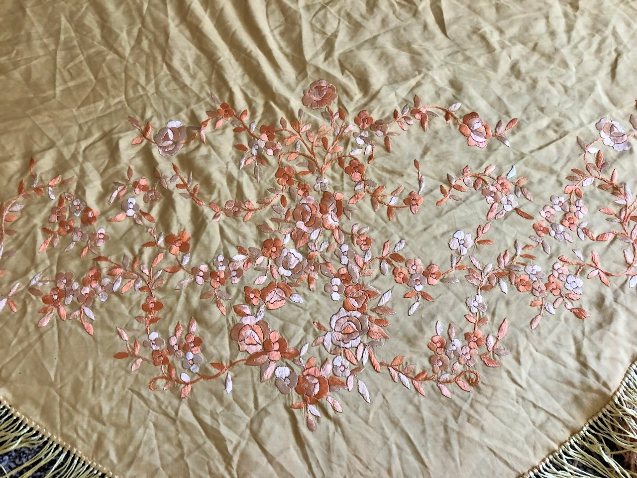 Antique Silk Victorian Fringe Piano Scarf Shawl Yellow Pink Floral Embroidered
