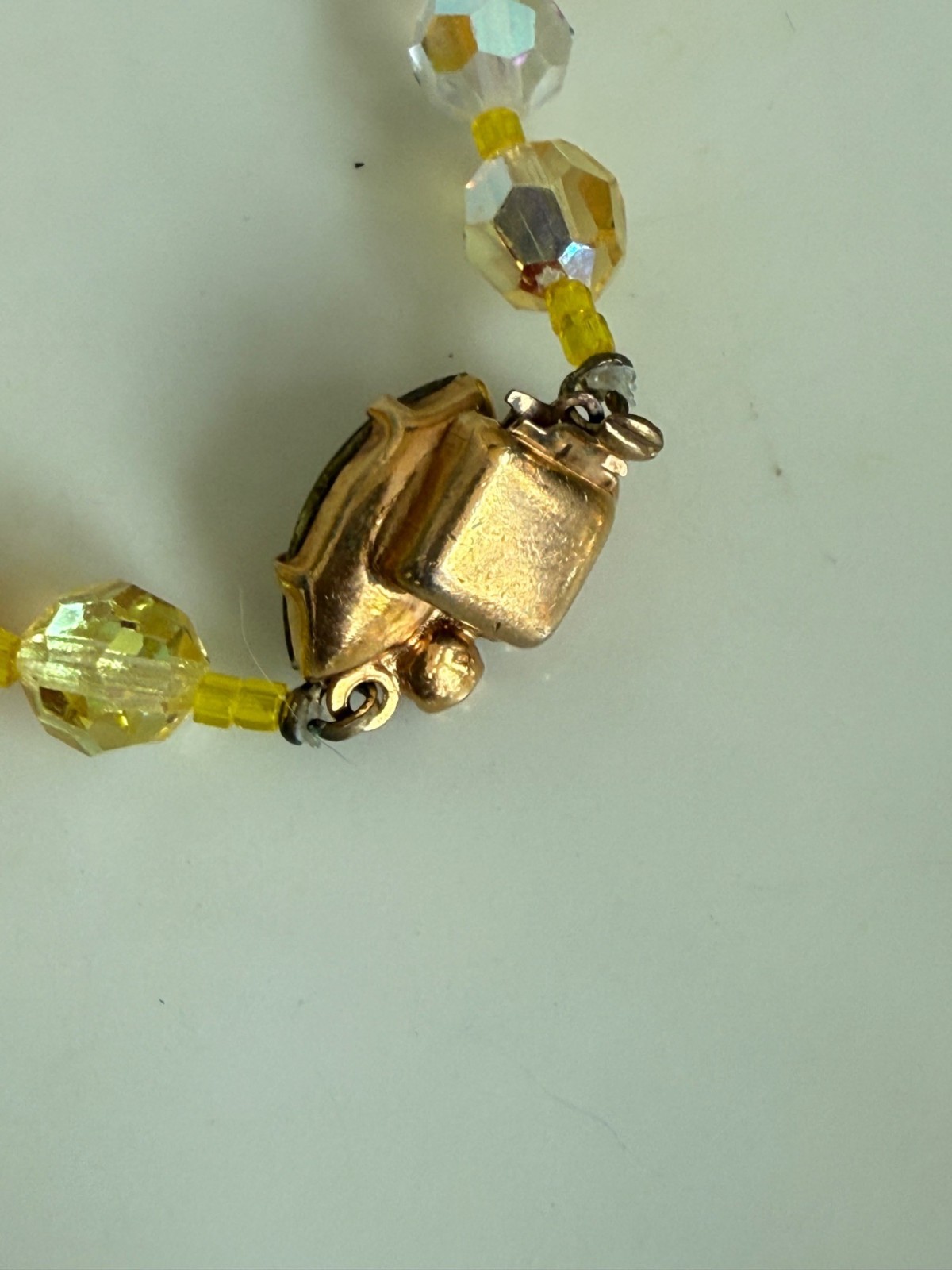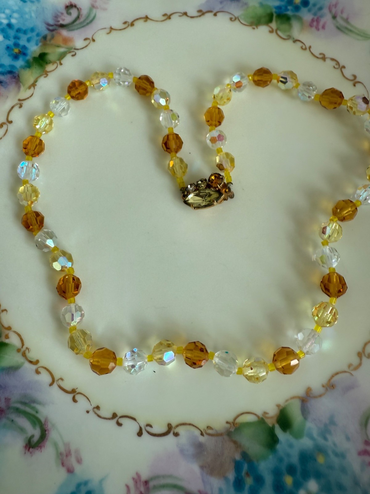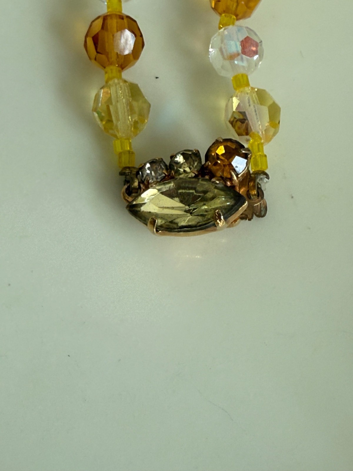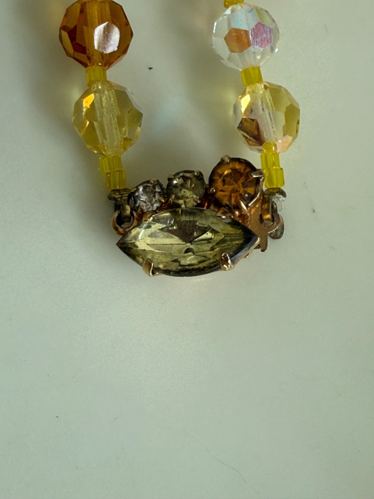Vintage 50's AB Glass Beaded Necklace Rhinestone Clasp Yellow Orange