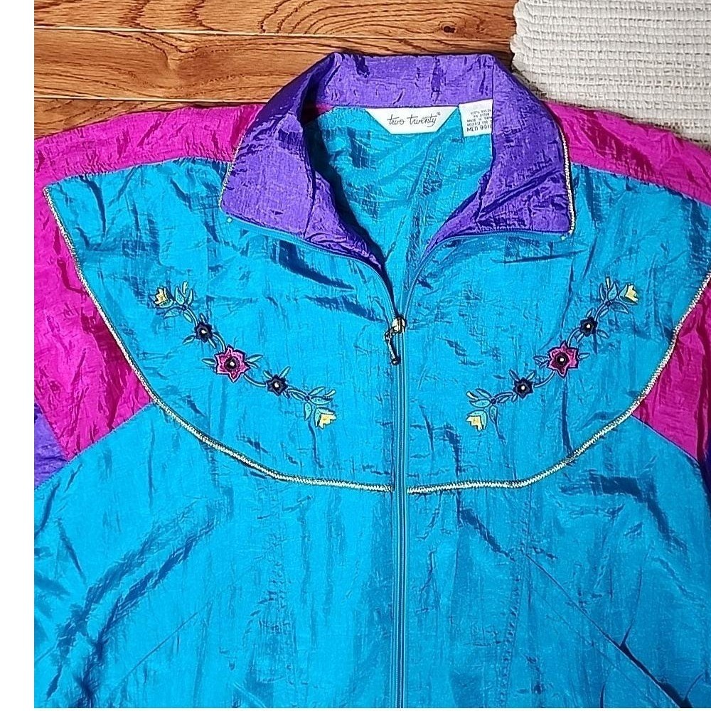 Vintage 80s Windbreaker Jacket Floral Embroidery Colorful Full Zip Two Twenty M