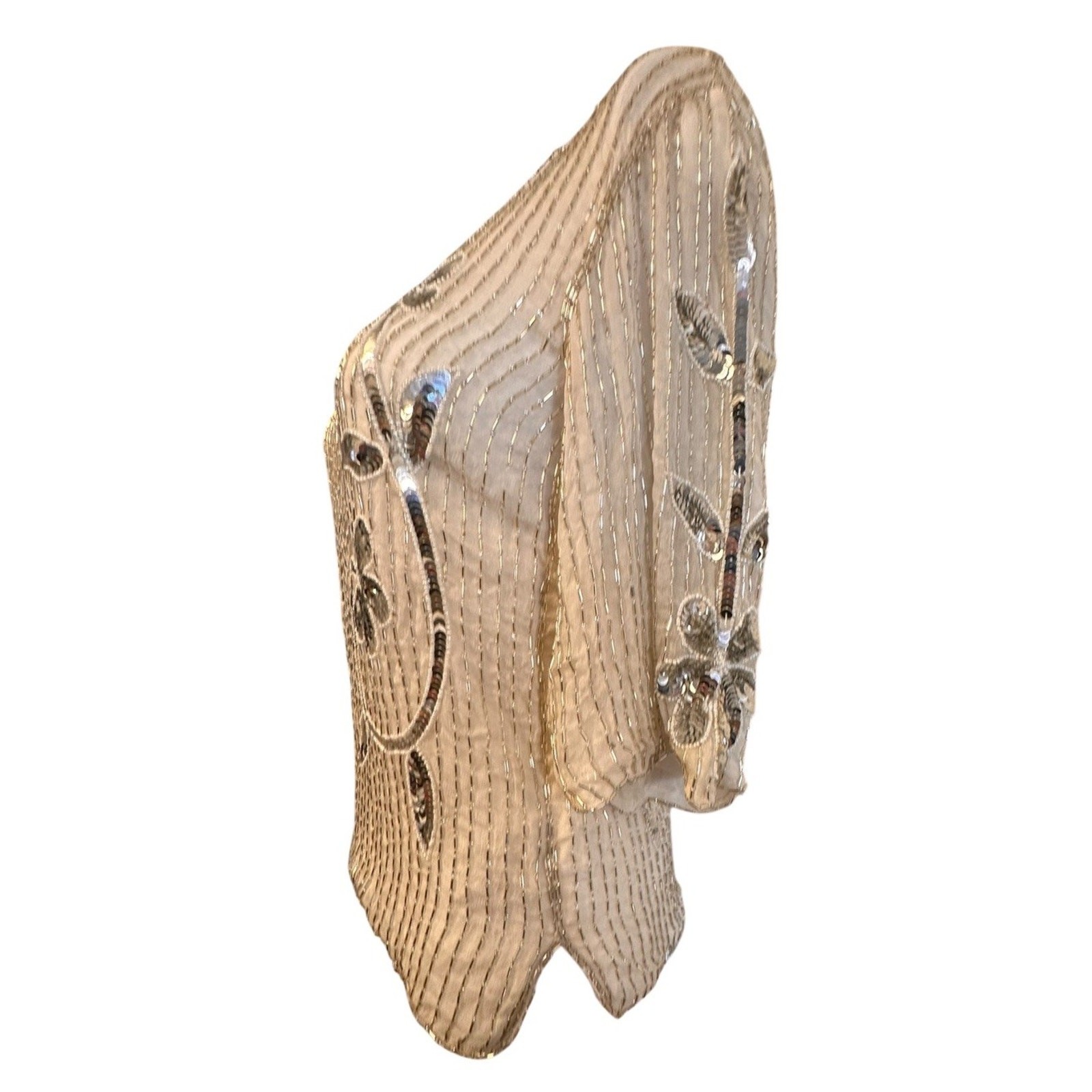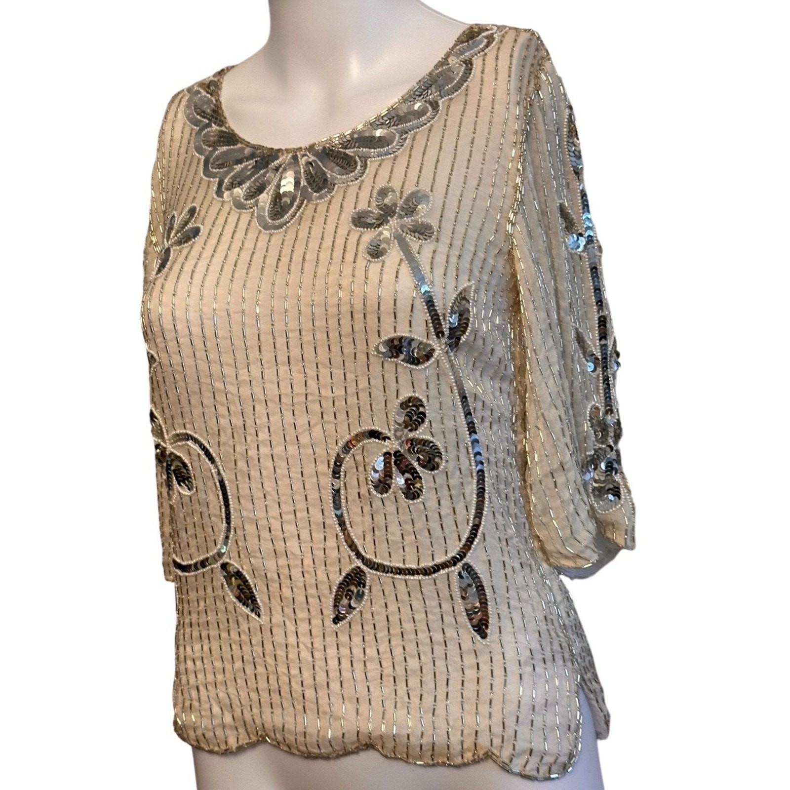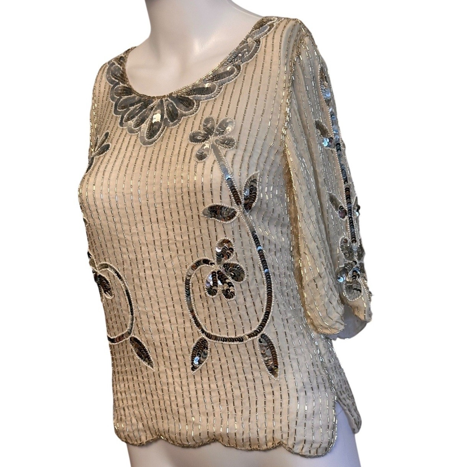 как выглядит Vintage 60s Ivory Sequin Floral Beaded Silk Top Sz M 3/4 Sleeve Scalloped Beaded фото
