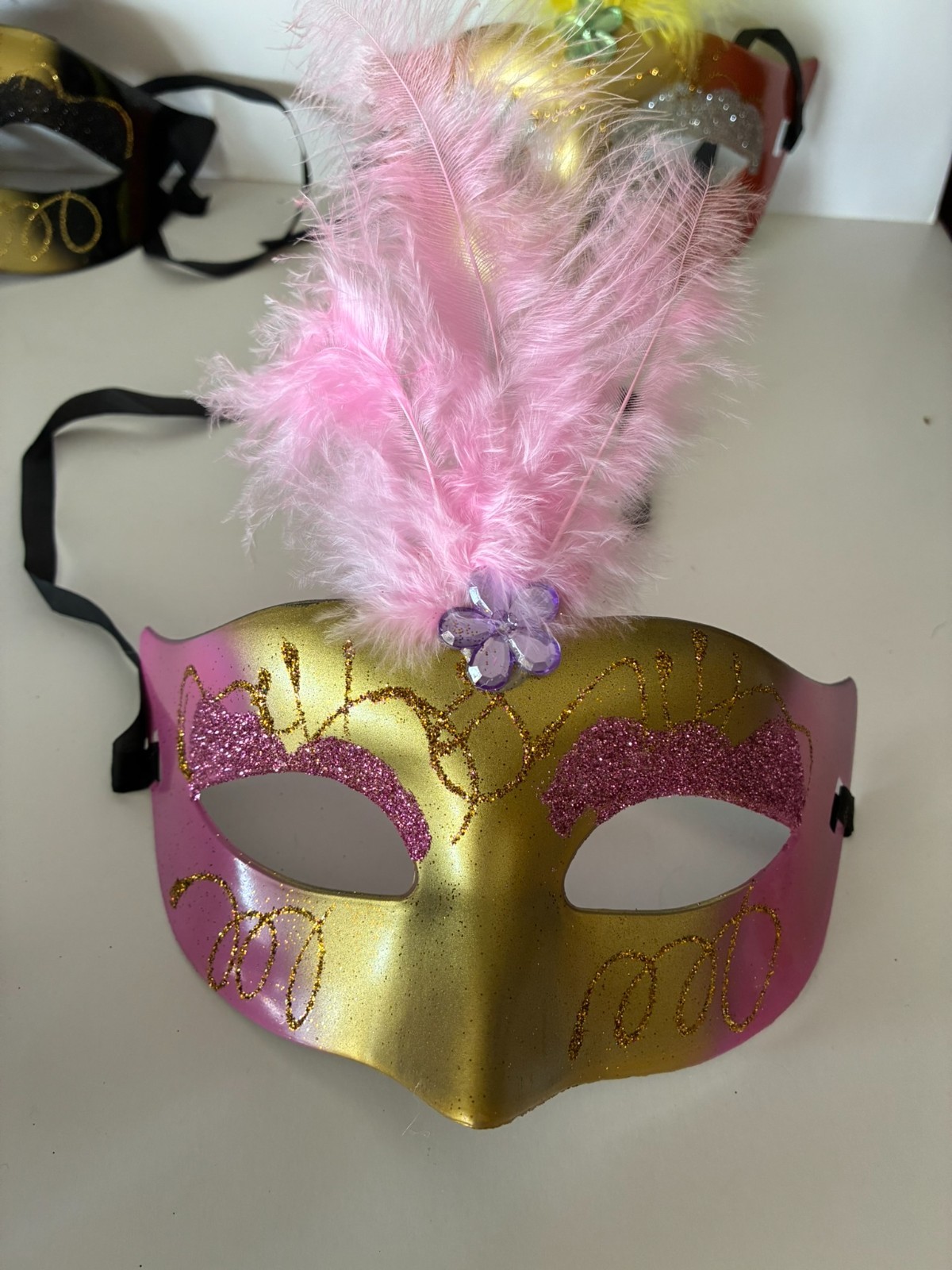 как выглядит Lot of 7 Mardi Gras masks glitter feathers bag of beads costume фото