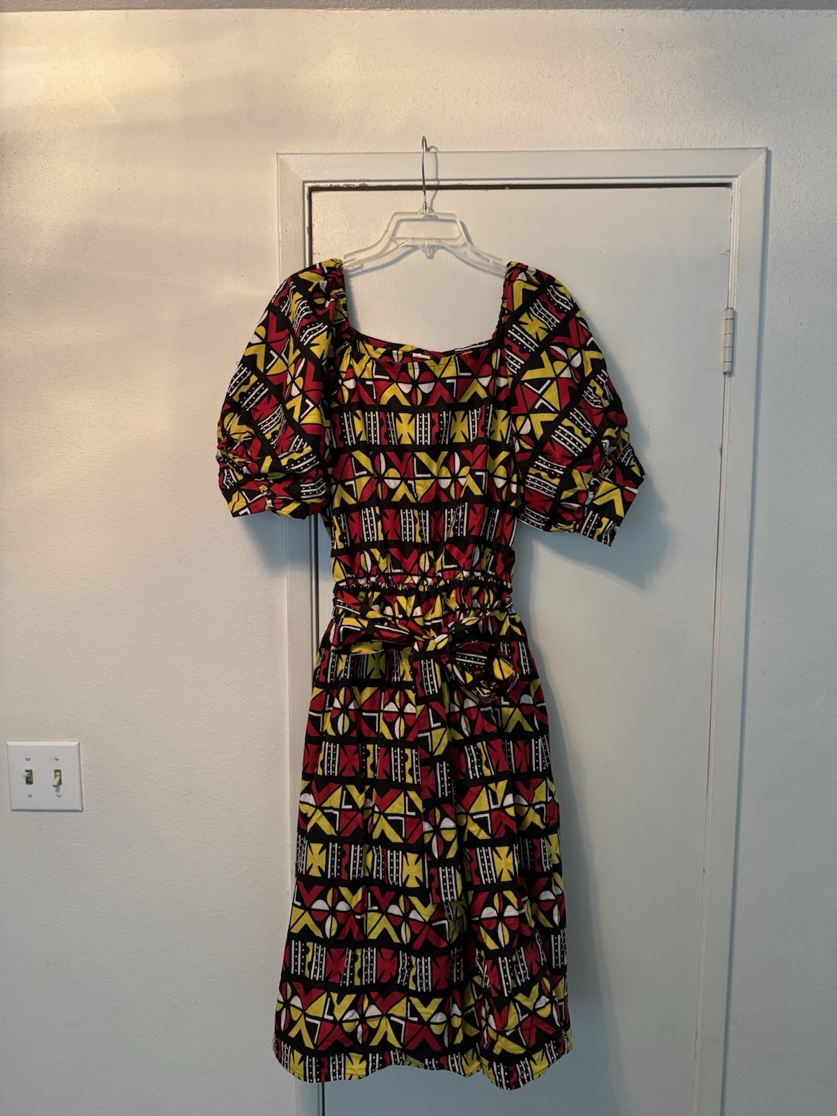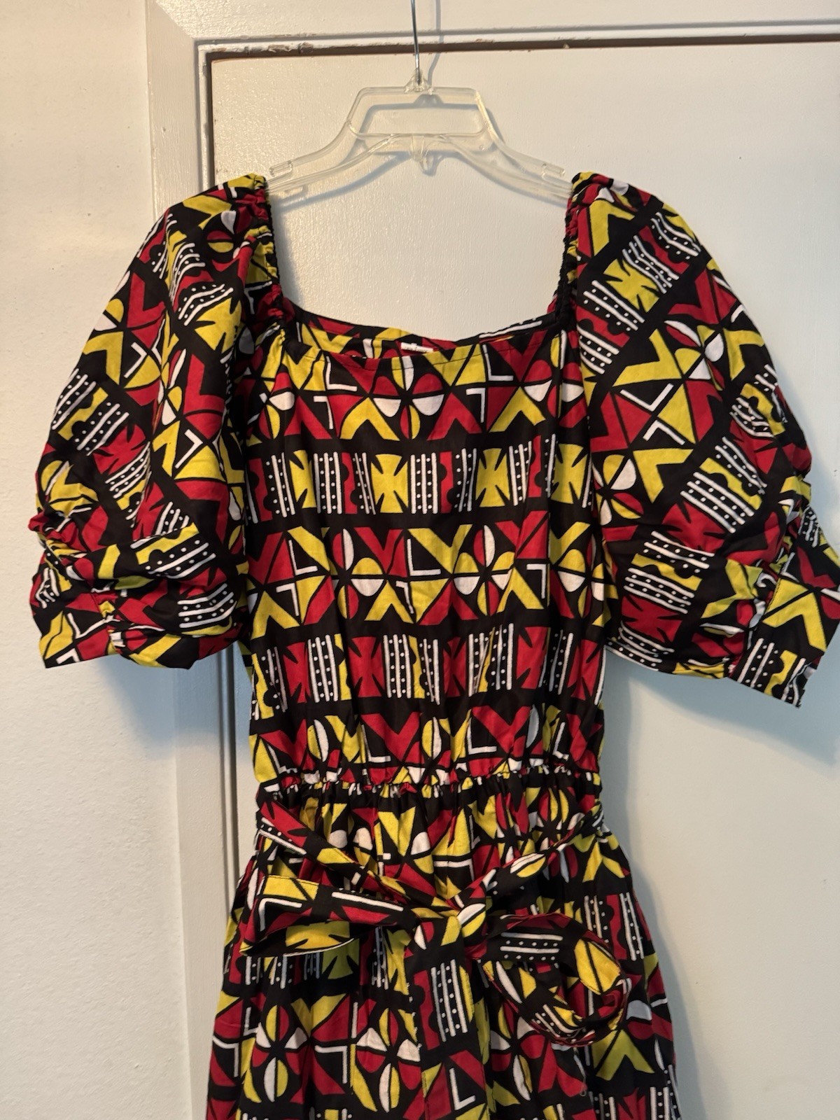 как выглядит AFRICAN PRINT LADIES MIDI DRESS WITH SQUARE NECK ,PUFF SLEEVES BELT EUC фото