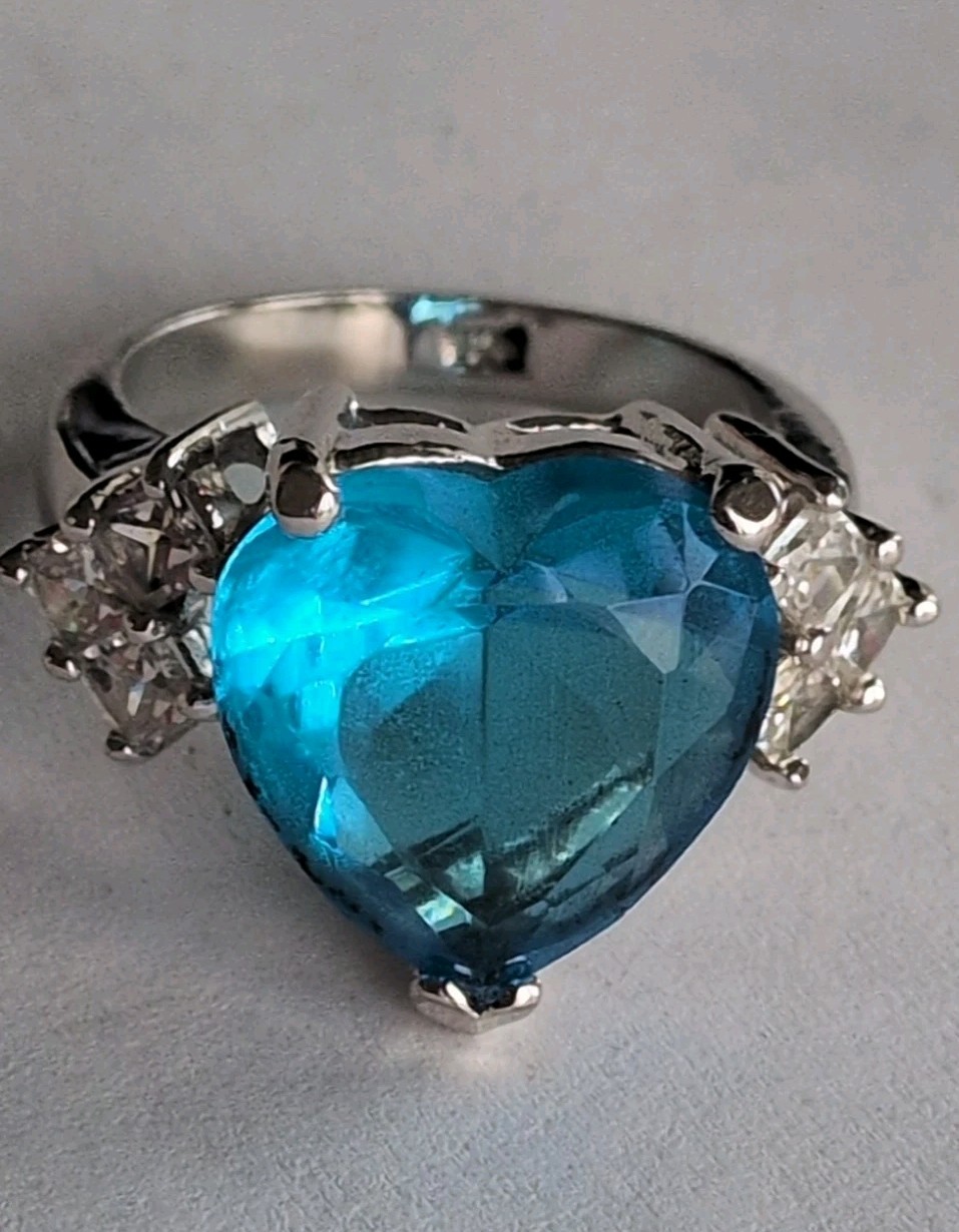 как выглядит VINTAGE STERLING SILVER BLUE HEART W/ CLEAR STONE SZ 9 COCKTAIL RING 7.9G фото