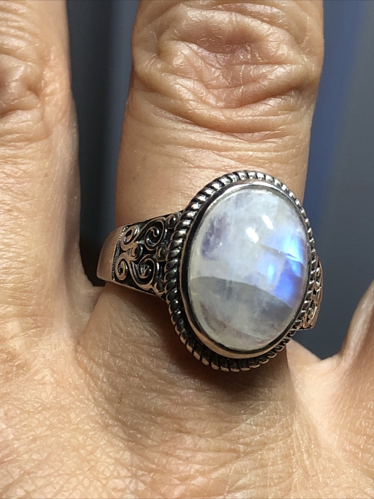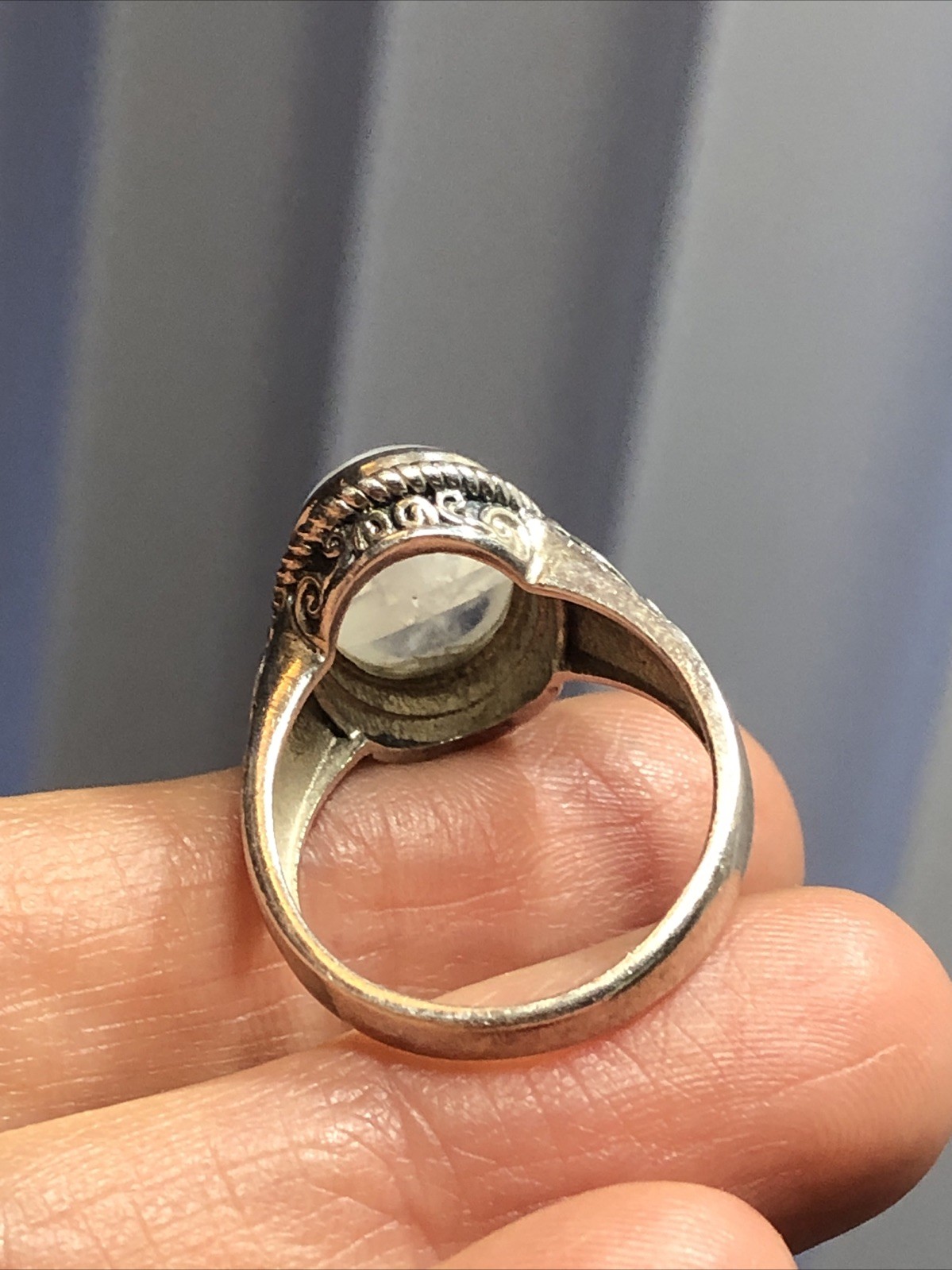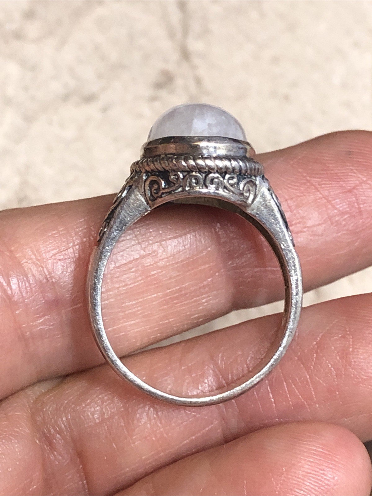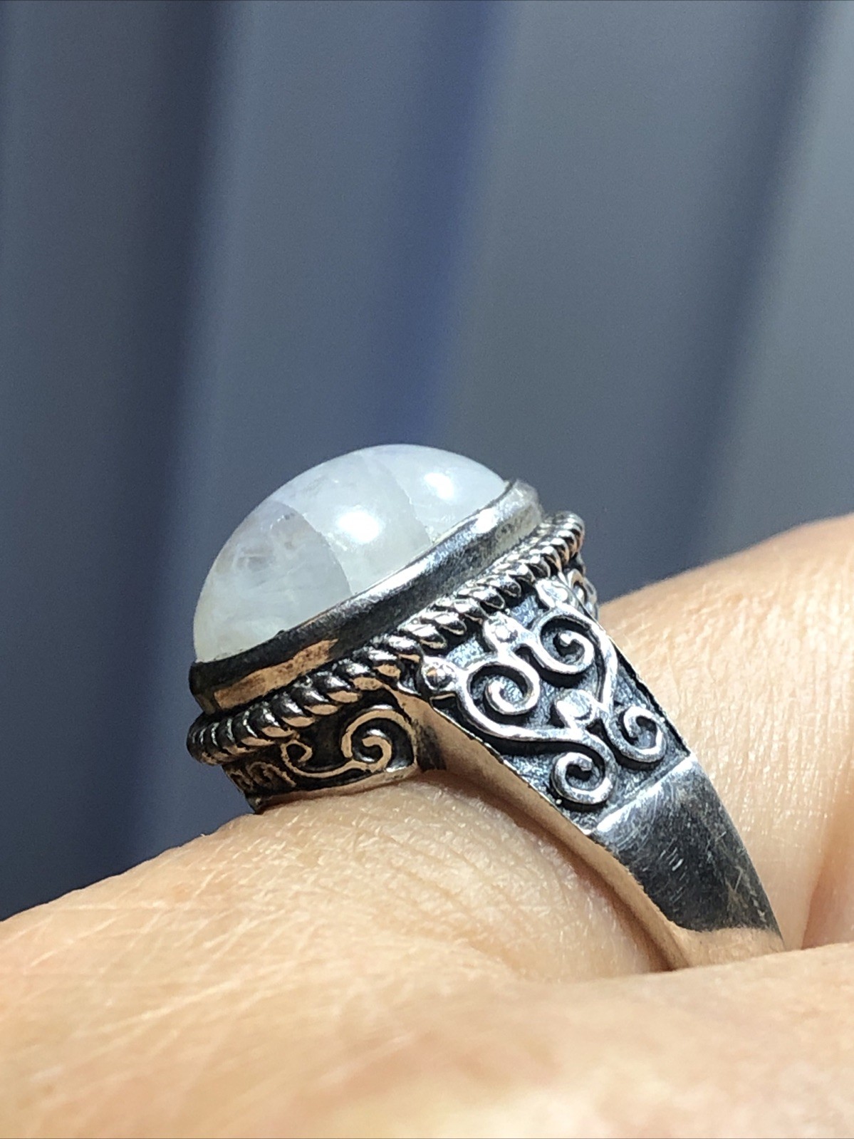 как выглядит 40. Vintage 925 Sterling Silver Oval Moonstone Swirl Rope Framed Ring 8.5s, 6.7g фото