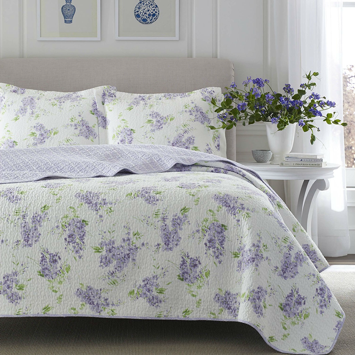 как выглядит Full / Queen size 3-Piece Cotton Quilt Set with White Purple Floral Pattern фото