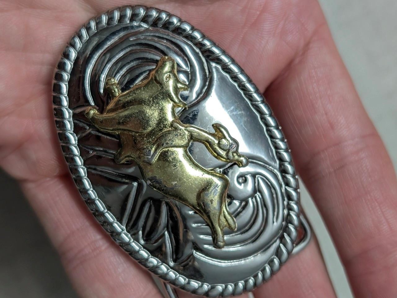 как выглядит vintage WESTERN belt buckle CHROME cowboy BULL RIDING rodeo фото